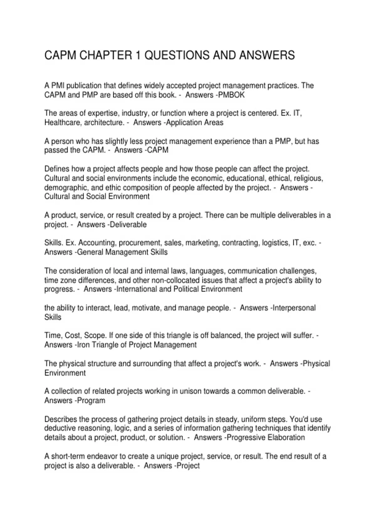 CAPM CHAPTER 1 QUESTIONS AND ANSWERS