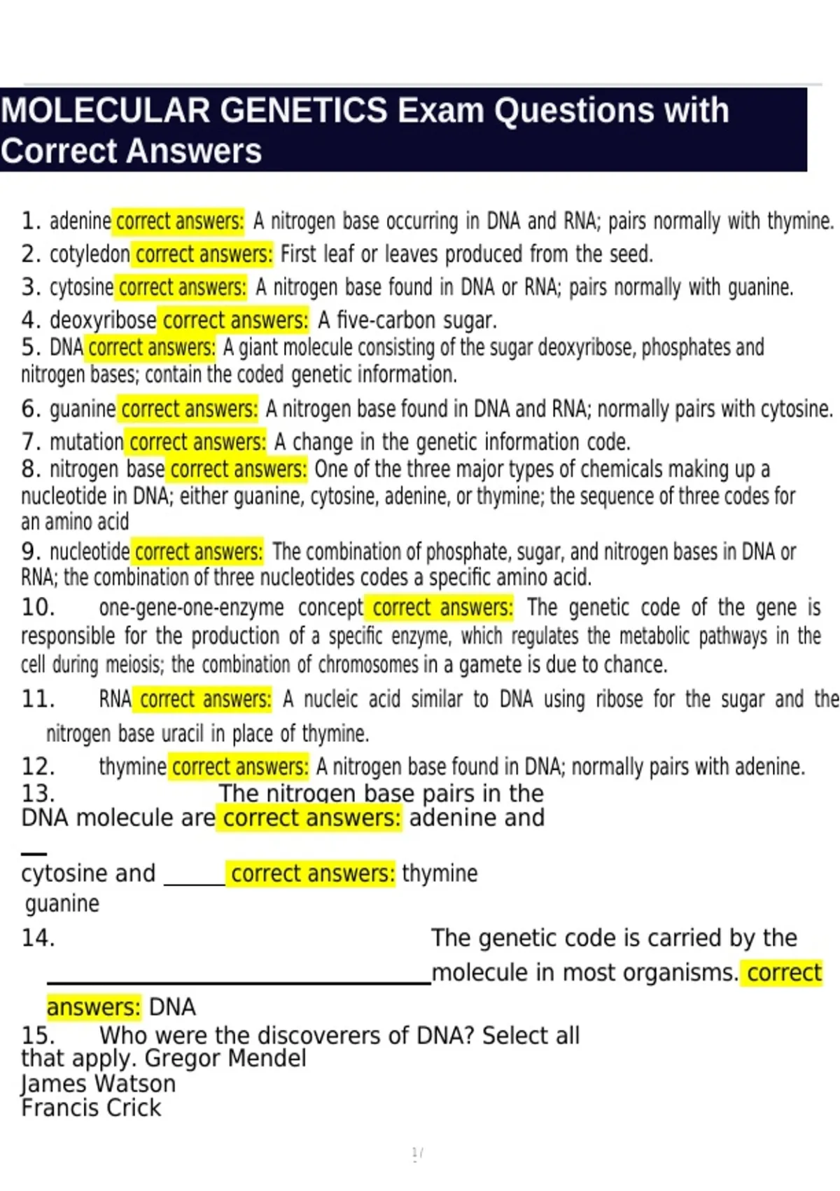 1. adenine correct answers: A nitrogen base occurring in DNA and RNA; pairs normally with thymine.