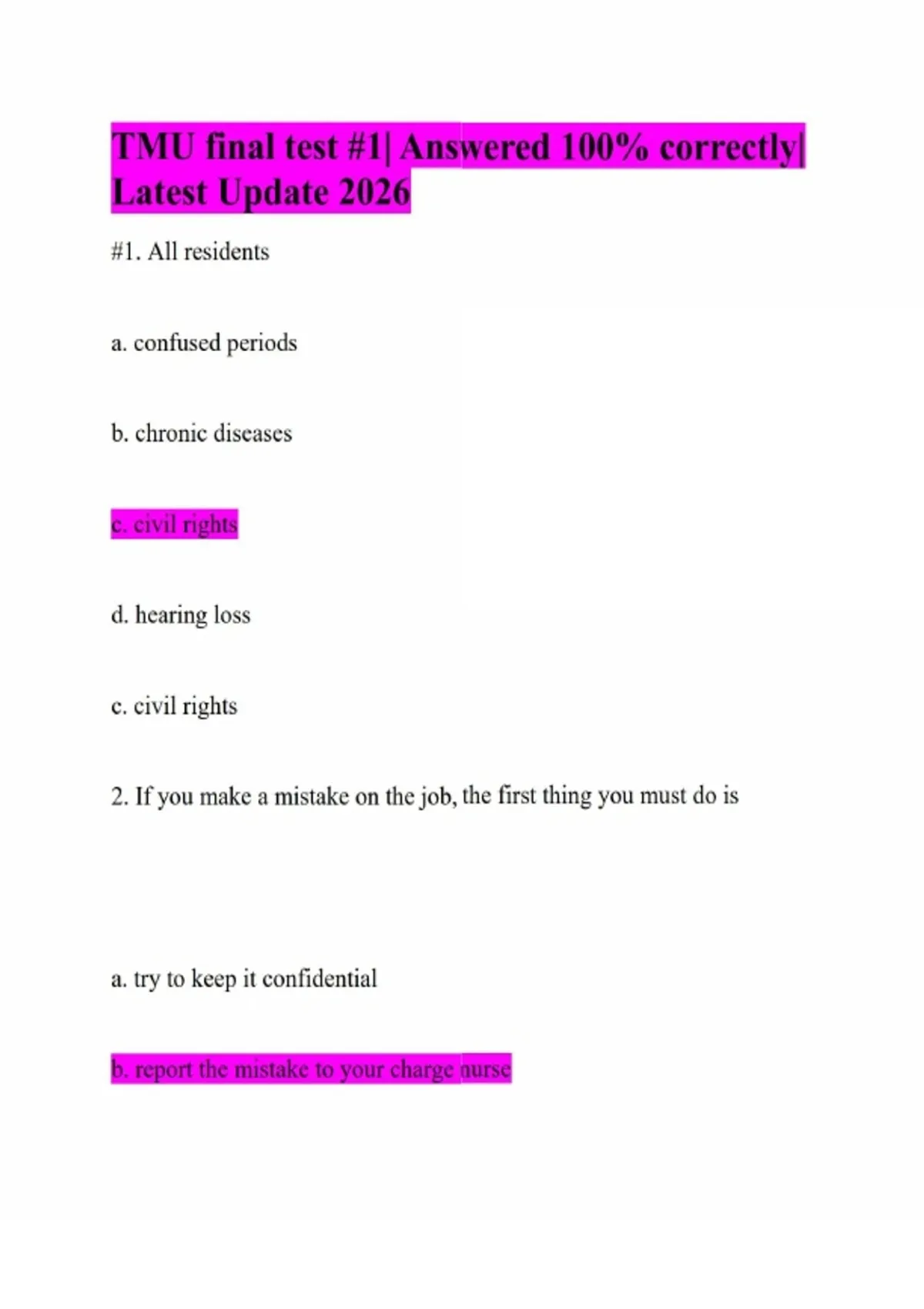 TMU final test #1| Answered 100% correctly| Latest Update 2026 #1. All residents a. confused periods b. chronic diseases c. civil rights d. hearing loss c. civil rights 2. If you make a mistake on the job, the first thing you must do is a. try to keep it confidential b. report the mistake to your charge nurse c. tell your co-workers d. deny it ever happened B 3. Nutrients are essential to our bodies for all the following reasons EXCEPT a. building and repairing tissues b. performing bodily functions c. providing energy for the work the body does d. limiting a person's life if taken externally D 4. Changing a resident's position at least every two hours a. keeps residents awake and alert b. prevents skin breakdown c. gives nursing assistants good experience d. is not very important for elderly residents B 5. The abbreviation ADL stands for a. alarm door light b. activities of daily living c. additional daily light d. advanced decay line B 6. Which of the following is NOT a mechanical aid used to reduce pressure a. foam pillow or pad b. alternating pressure mattress c. bed cradle d. autoclave D 7. The basic needs of the elderly include