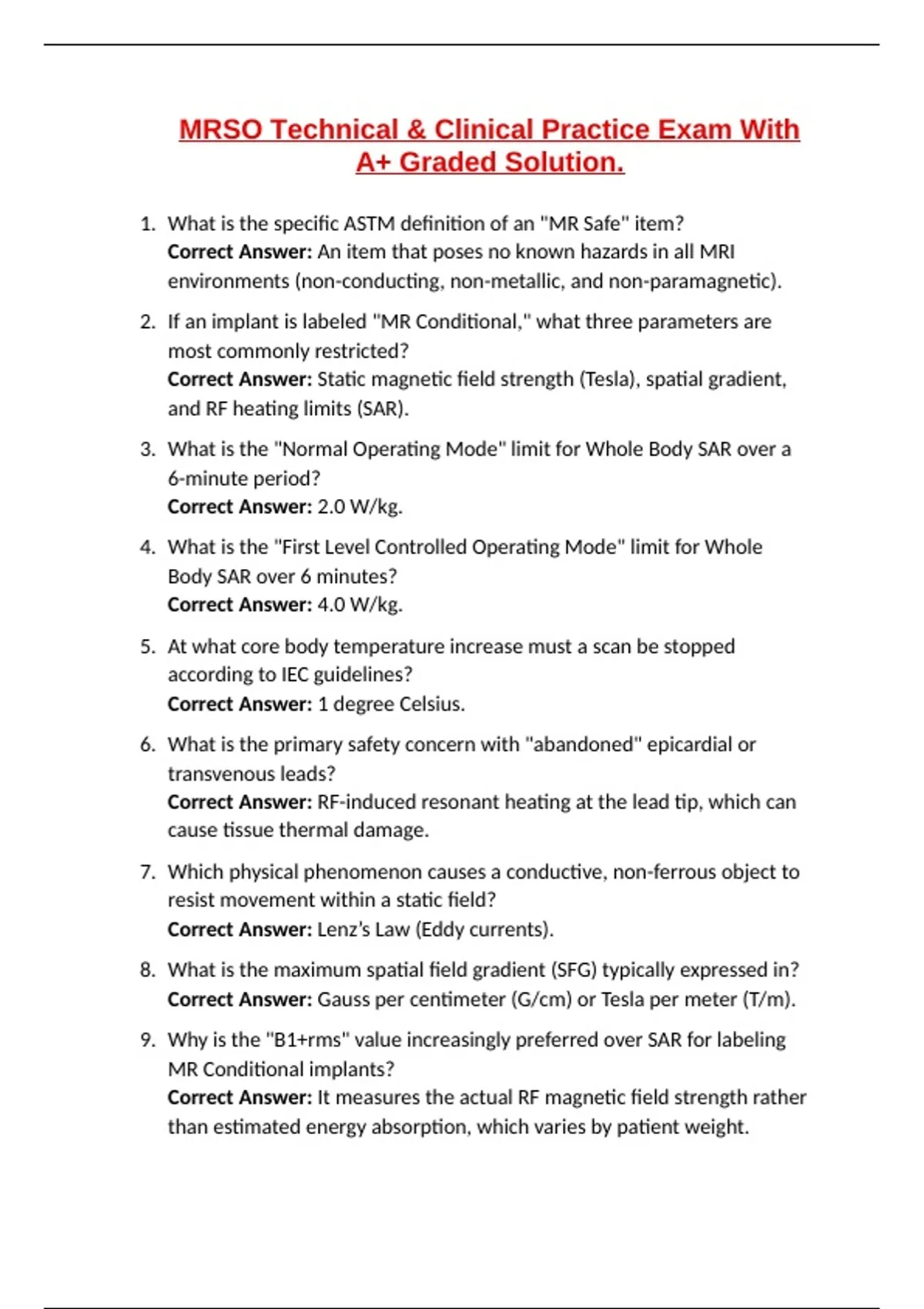 MRSO Technical & Clinical Practice Exam With A+ Graded Solution. 1. What is the specific ASTM definition of an "MR Safe" item? Correct Answer: An item that poses no known hazards in all MRI environments (non-conducting, non-metallic, and non-paramagnetic). 2. If an implant is labeled "MR Conditional," what three parameters are most commonly restricted? Correct Answer: Static magnetic field strength (Tesla), spatial gradient, and RF heating limits (SAR). 3. What is the "Normal Operating Mode" limit for Whole Body SAR over a 6-minute period? Correct Answer: 2.0 W/kg. 4. What is the "First Level Controlled Operating Mode" limit for Whole Body SAR over 6 minutes? Correct Answer: 4.0 W/kg. 5. At what core body temperature increase must a scan be stopped according to IEC guidelines