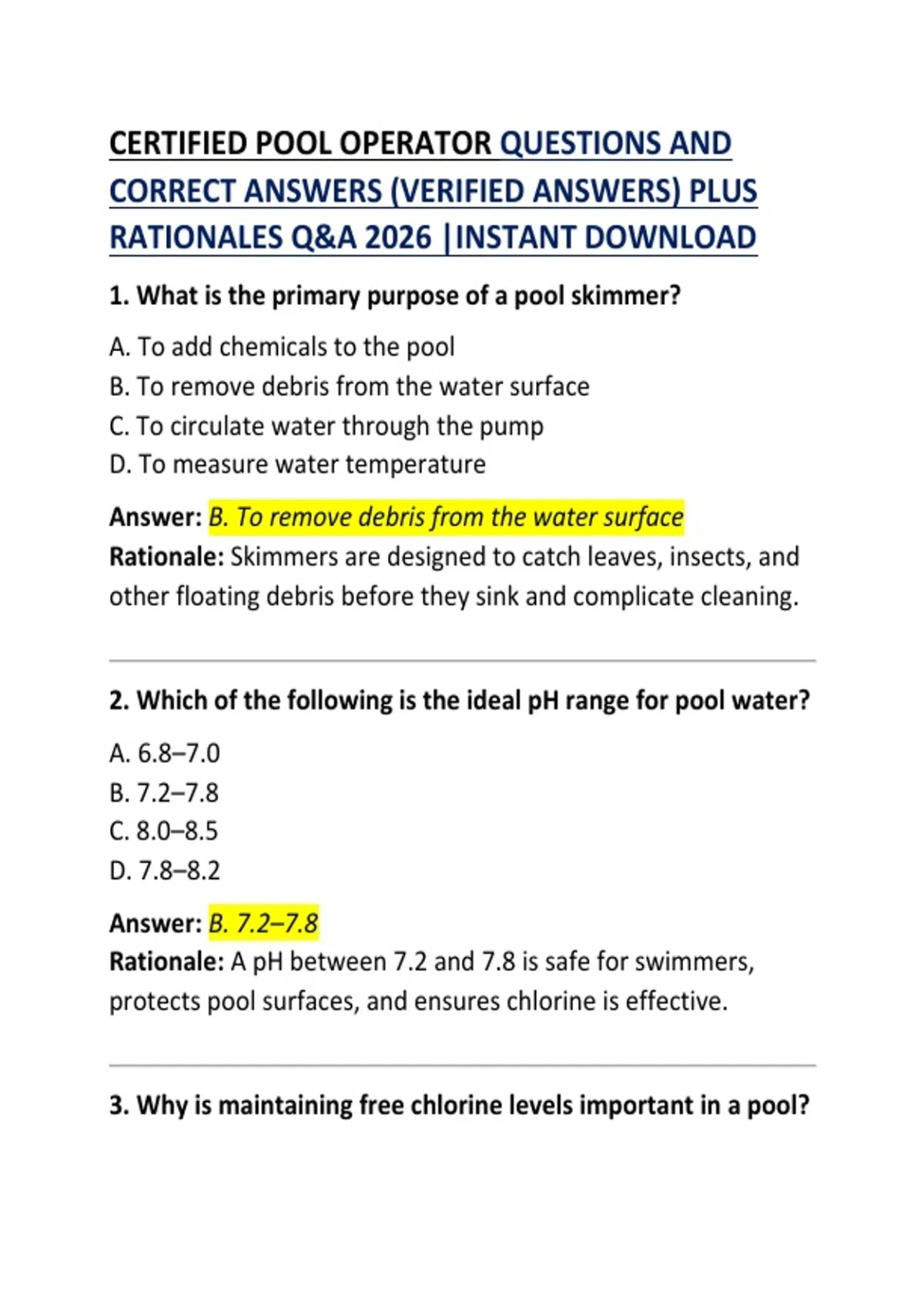 3. Why is maintaining free chlorine levels important in a pool?