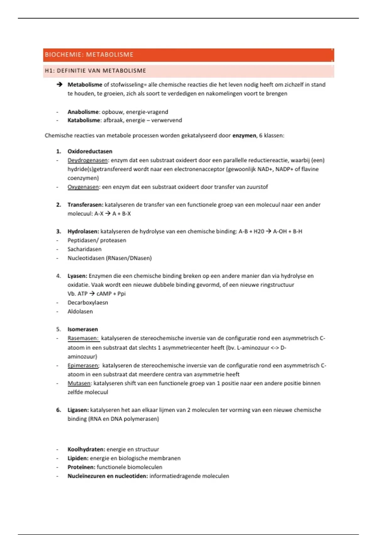 Chemische reacties van metabole processen worden gekatalyseerd door enzymen, 6 klassen: