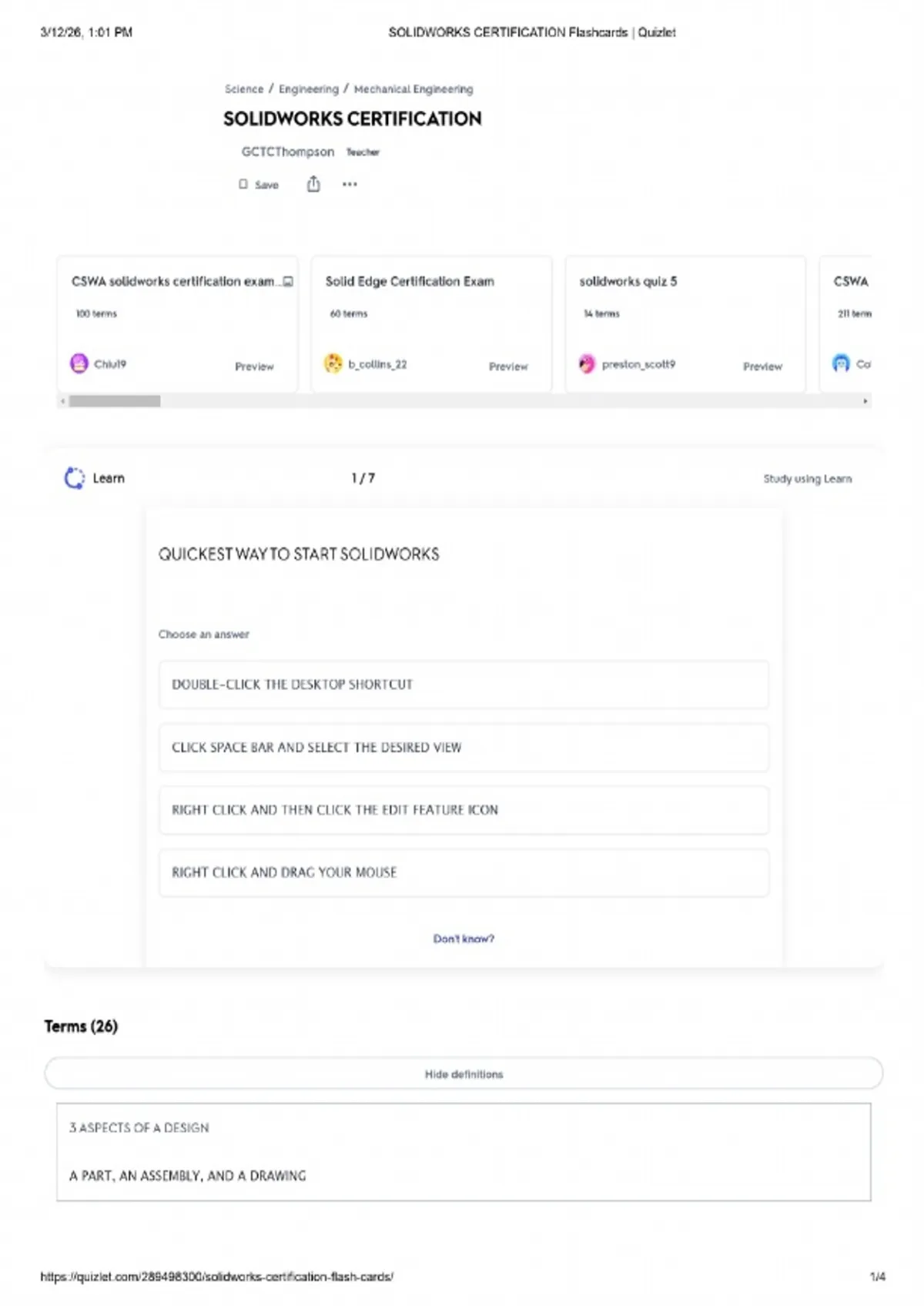 SOLIDWORKS Certification Flashcards / Quizlet Study Guide / Score 100% / Update