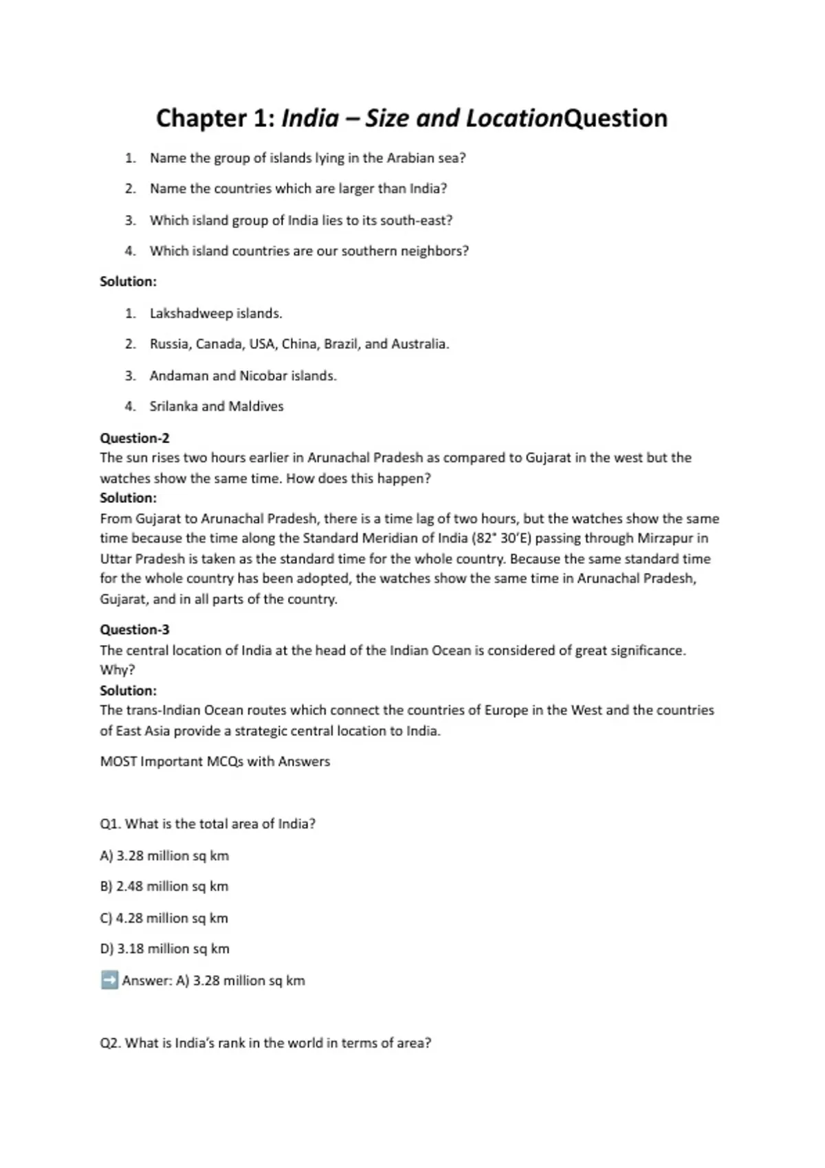 Q2. What is India’s rank in the world in terms of area?