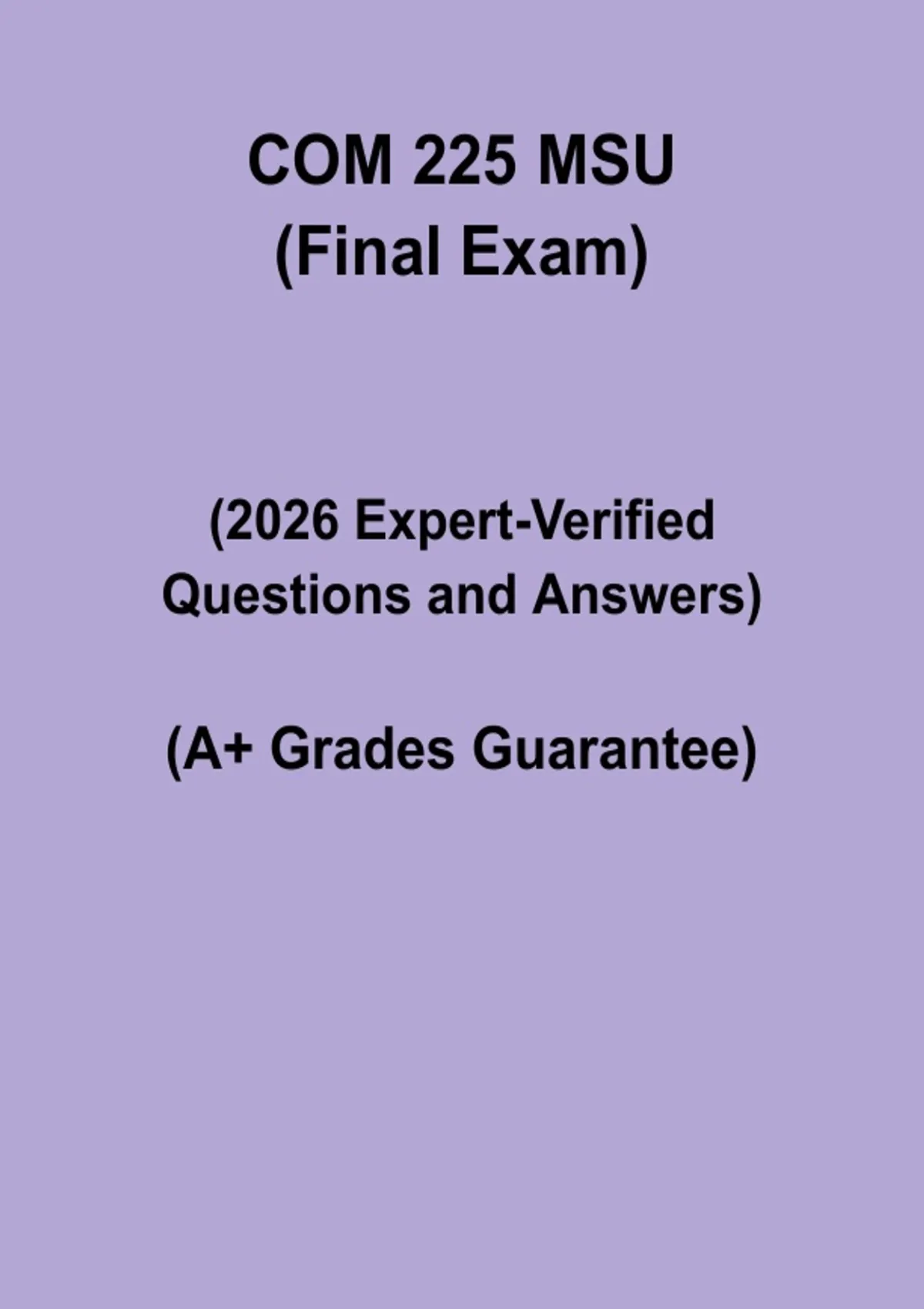 Prepare effectively for the COM 225 Final Exam at Michigan State University with this comprehensive study guide. This document includes practice questions, verified answers, and detailed explanations covering key communication concepts, theories, and practical application strategies. Ideal for MSU students, it reinforces understanding, improves retention, and builds confidence to excel in the COM 225 final exam.