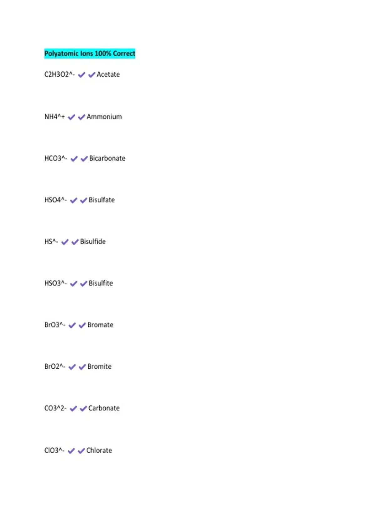 Polyatomic Ions 100% Correct