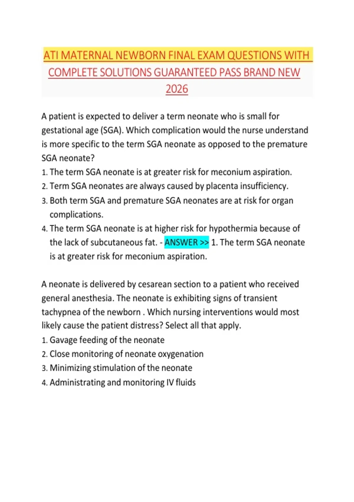 ATI MATERNAL NEWBORN FINAL EXAM QUESTIONS WITH