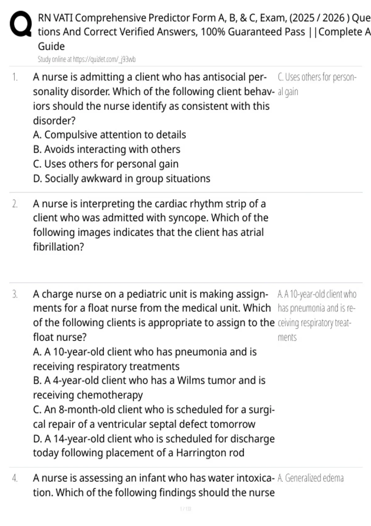 RN VATI Comprehensive Predictor Form A, B, & C, Exam, ( ) Ques
