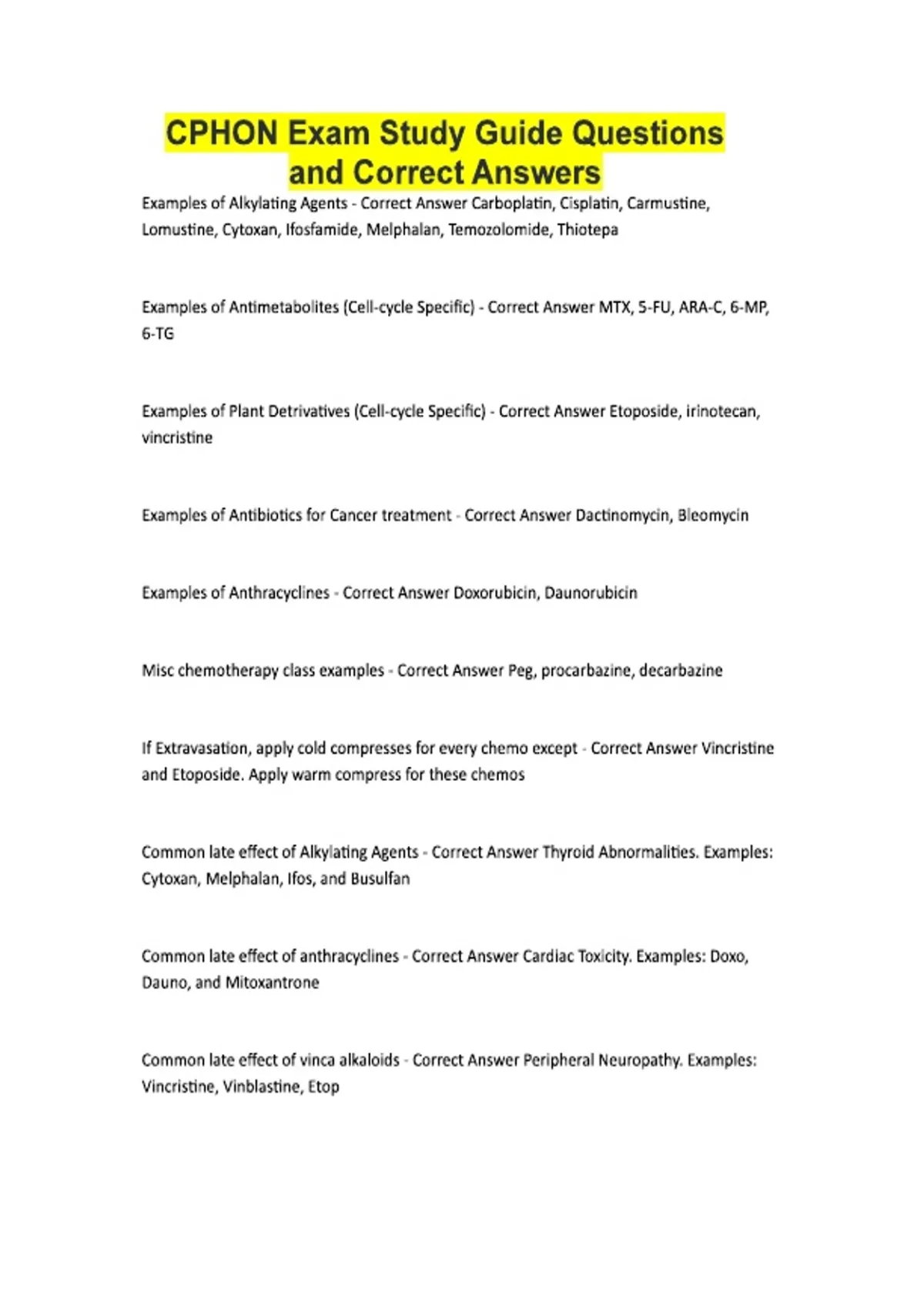 CPHON Exam Study Guide Questions and Correct Answers Examples of Alkylating Agents - Correct Answer Carboplatin, Cisplatin, Carmustine, Lomustine, Cytoxan, Ifosfamide, Melphalan, Temozolomide, Thiotepa Examples of Antimetabolites (Cell-cycle Specific) - Correct Answer MTX, 5-FU, ARA-C, 6-MP, 6-TG Examples of Plant Detrivatives (Cell-cycle Specific) - Correct Answer Etoposide, irinotecan, vincristine Examples of Antibiotics for Cancer treatment - Correct Answer Dactinomycin, Bleomycin Examples of Anthracyclines - Correct Answer Doxorubicin, Daunorubicin Misc chemotherapy class examples - Correct Answer Peg, procarbazine, decarbazine If Extravasation, apply cold compresses for every chemo except - Correct Answer Vincristine and Etoposide. Apply warm compress for these chemos Common late effect of Alkylating Agents - Correct Answer Thyroid Abnormalities. Examples: Cytoxan, Melphalan, Ifos, and Busulfan Common late effect of anthracyclines - Correct Answer Cardiac Toxicity. Examples: Doxo, Dauno, and Mitoxantrone Common late effect of vinca alkaloids - Correct Answer Peripheral Neuropathy. Examples: Vincristine, Vinblastine, Etop Common late effect of heavy metal agents - Correct Answer Hearing Deficits. Examples: Cisplatin and Carboplatin Common late effect of Hormone Agents - Correct Answer Cataracts, Glaucoma, Uveitis: Prednisone and Dexamethasone Common Cancers with Late Thyroid Issues - Correct Answer Hodgekins, Germ Cell, CNS tumors, NBL treated with radiolabeled Ab, BMT with TBI Common Cancers with Late GU Issues - Correct Answer NBL, Wilm's, Fanconis Common Cancers with Late Reproductive Issues - Correct Answer Medulloblastoma, Osteosarcoma, Ewings, and HSCT