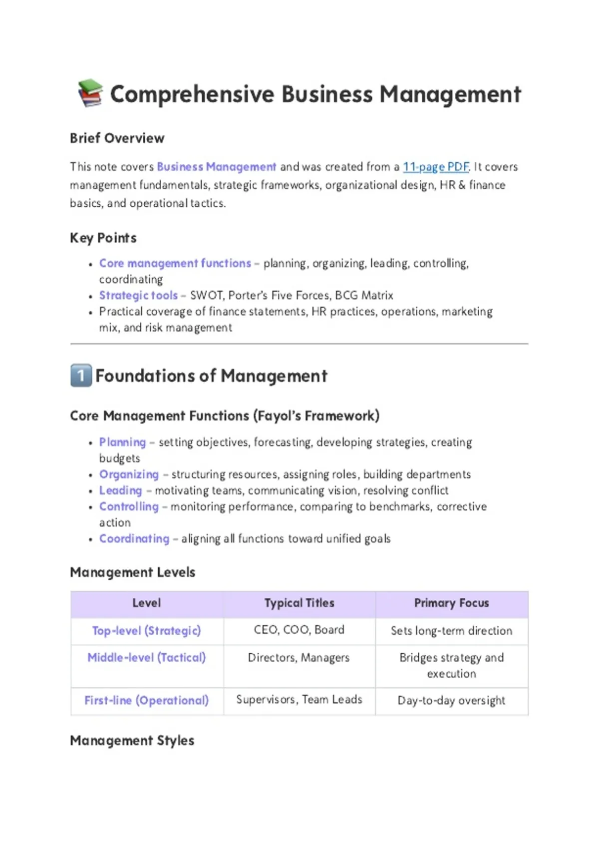 This note covers Business Management and was created from a 11-page PDF. It covers