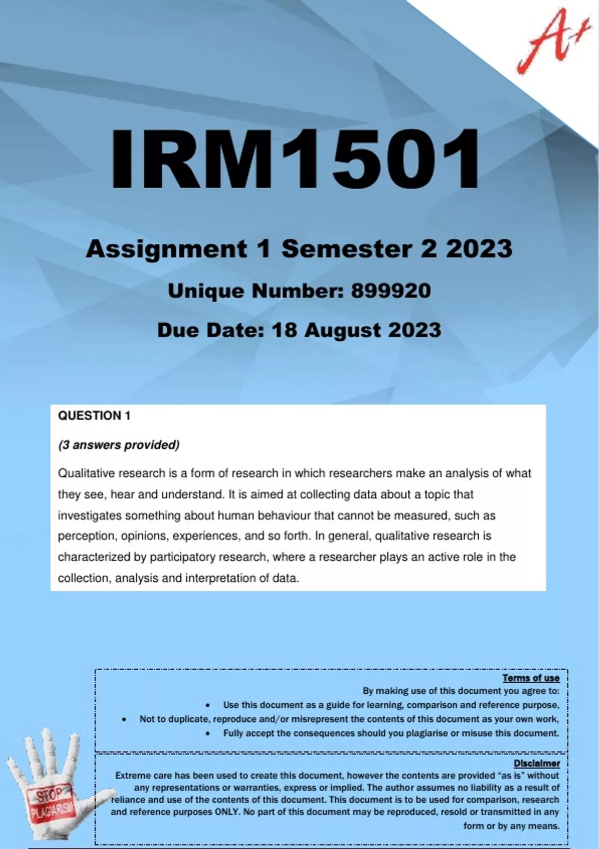 I understand Unisa’s policy on plagiarism. This examination is my original work produced by myself.