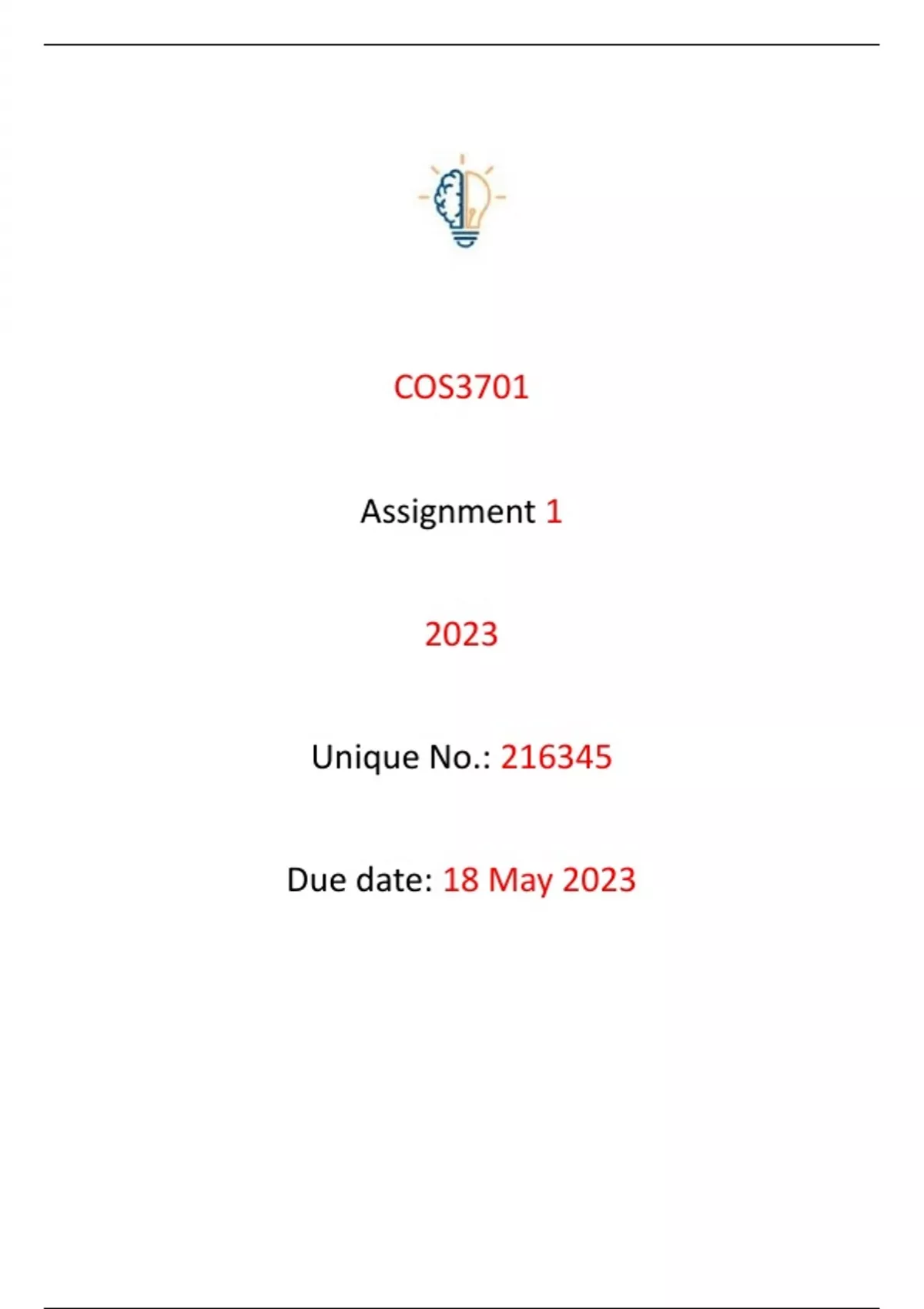 Complete solutions to all 5 questions of COS3701 Assignment 1 2023 with detailed explanations for each question. Strong distinction guaranteed! Feel free to contact us should you have any queries and please remember to leave a review if you find this document helpful. Best wishes!