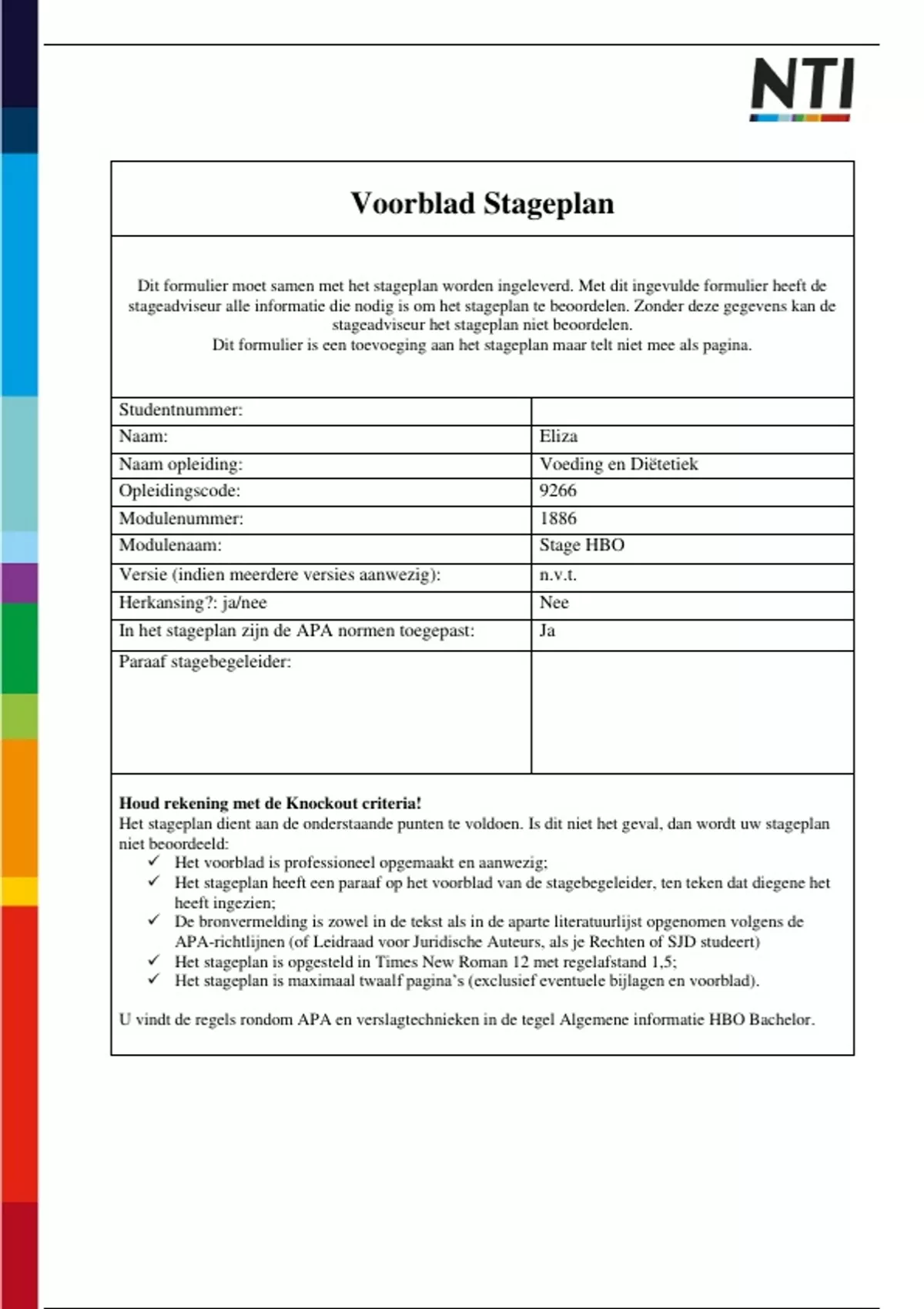 Dit formulier moet samen met het stageplan worden ingeleverd. Met dit ingevulde formulier heeft de