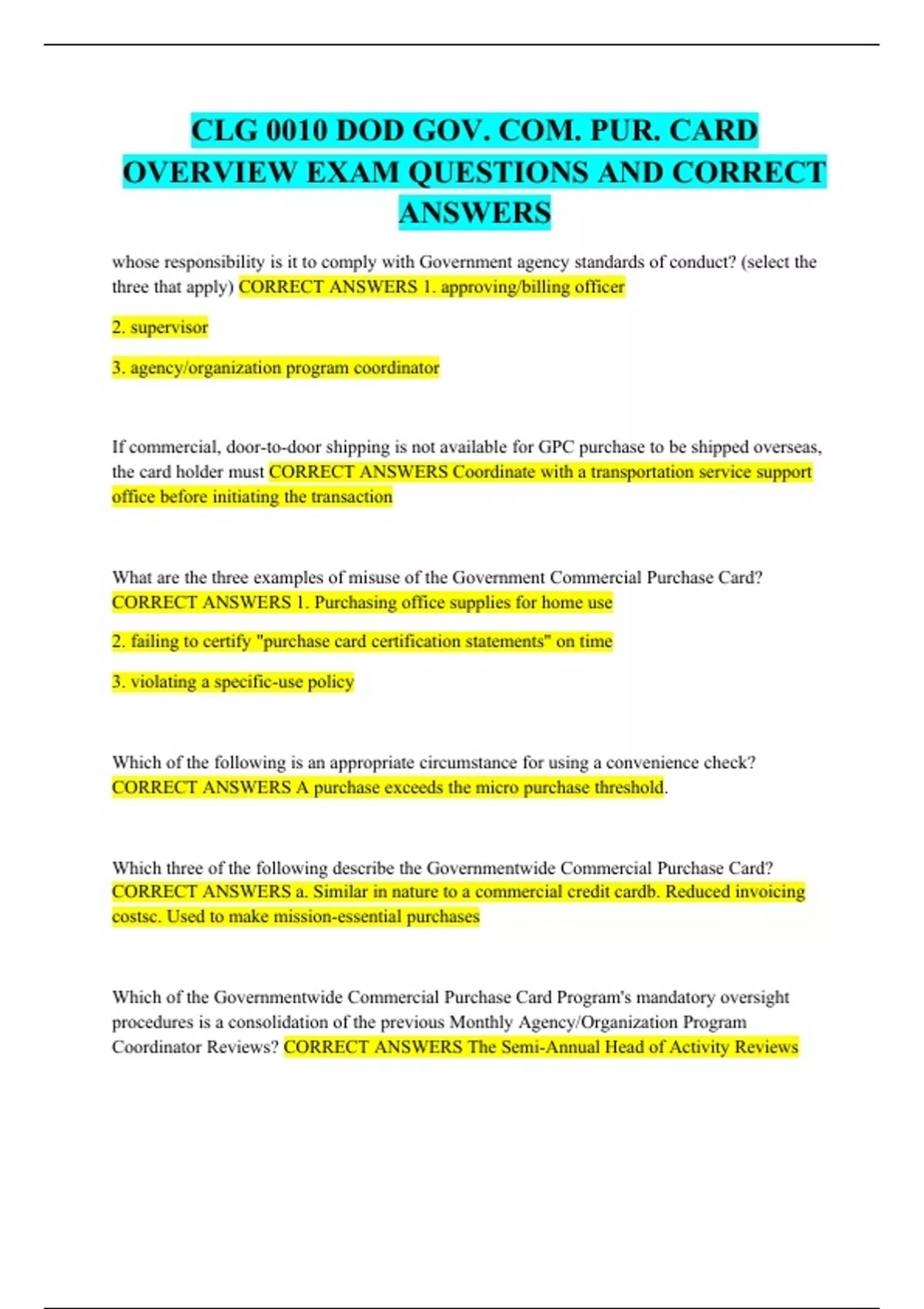 CLG 0010 DOD GOV. COM. PUR. CARD OVERVIEW EXAM QUESTIONS AND CORRECT ANSWERS whose responsibility is it to comply with Government agency standards of conduct? (select the three that apply) If commercial, door-to-door shipping is not available for GPC purchase to be shipped overseas, the card holder must What are the three examples of misuse of the Government Commercial Purchase Card? Which of the following is an appropriate circumstance for using a convenience check?. Which three of the following describe the Governmentwide Commercial Purchase Card? Which of the Governmentwide Commercial Purchase Card Program's mandatory oversight procedures is a consolidation of the previous Monthly Agency/Organization Program Coordinator Reviews? In the event that a Cardholder reports a misplaced, lost, or stolen card or check, which of the following is true? DOD policy allows for GCP Card billing statement certification prior to certification that all items submitted for payment have been received in order to (select all three that apply). The secretary defense authorize an increase in the micro purchase threshold to $20,000 to support declared contingency operations in Afghanistan. Several personnel in your office have been needing new laptops, so this is a good time to take advantage of the increase and purchase 20 laptops at $500 each, for the price of $10,000.