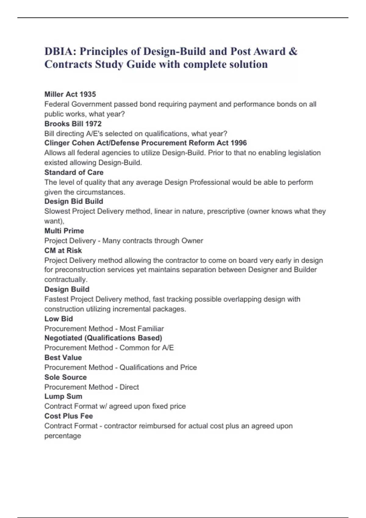 DBIA: Principles of Design-Build and Post Award & Contracts Study Guide with complete solution Miller Act 1935 Federal Government passed bond requiring payment and performance bonds on all public works, what year? Brooks Bill 1972 Bill directing A/E's selected on qualifications, what year? Clinger Cohen Act/Defense Procurement Reform Act 1996 Allows all federal agencies to utilize Design-Build. Prior to that no enabling legislation existed allowing Design-Build. Standard of Care The level of quality that any average Design Professional would be able to perform given the circumstances. Design Bid Build Slowest Project Delivery method, linear in nature, prescriptive (owner knows what they want), Multi Prime Project Delivery - Many contracts through Owner CM at Risk Project Delivery method allowing the contractor to come on board very early in design for preconstruction services yet maintains separation between Designer and Builder contractually. Design Build Fastest Project Delivery method, fast tracking possible overlapping design with construction utilizing incremental packages. Low Bid Procurement Method - Most Familiar Negotiated (Qualifications Based) Procurement Method - Common for A/E Best Value Procurement Method - Qualifications and Price Sole Source Procurement Method - Direct Lump Sum Contract Format w/ agreed upon fixed price Cost Plus Fee Contract Format - contractor reimbursed for actual cost plus an agreed upon percentage