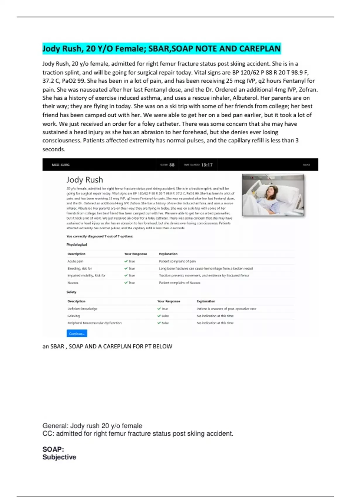 Jody Rush, 20 YO Female; SBAR,SOAP NOTE AND CAREPLAN
