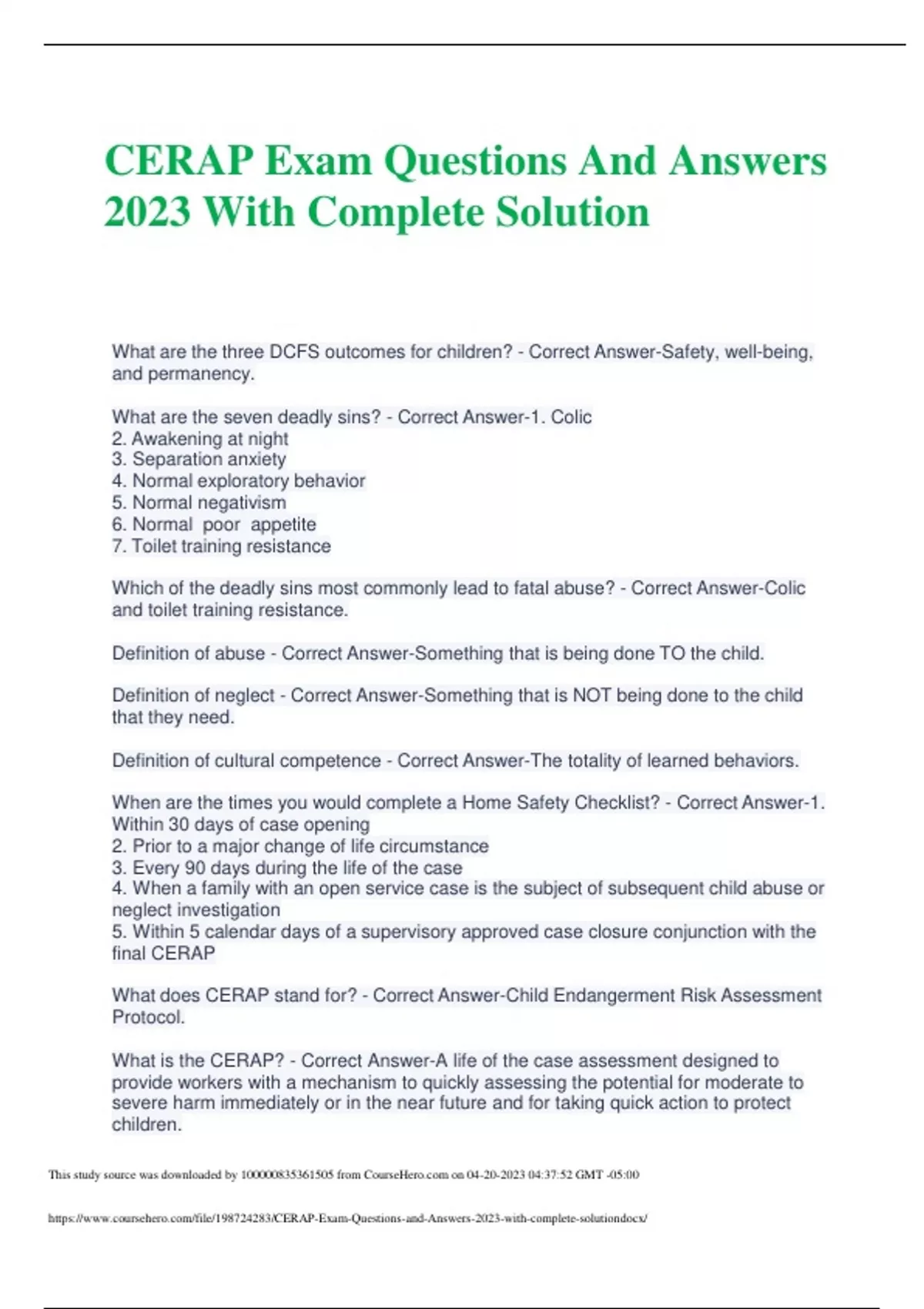 CERAP Exam Questions And Answers 2023 With Complete Solution What are the three DCFS outcomes for children? - Correct Answer-Safety, well-being, and permanency. What are the seven deadly sins? - Correct Answer-1. Colic 2. Awakening at night 3. Separation anxiety 4. Normal exploratory behavior 5. Normal negativism 6. Normal poor appetite 7. Toilet training resistance Which of the deadly sins most commonly lead to fatal abuse? - Correct Answer-Colic and toilet training resistance. Definition of abuse - Correct Answer-Something that is being done TO the child. Definition of neglect - Correct Answer-Something that is NOT being done to the child that they need. Definition of cultural competence - Correct Answer-The totality of learned behaviors. When are the times you would complete a Home Safety Checklist? - Correct Answer-1. Within 30 days of case opening 2. Prior to a major change of life circumstance 3. Every 90 days during the life of the case 4. When a family with an open service case is the subject of subsequent child abuse or neglect investigation 5. Within 5 calendar days of a supervisory approved case closure conjunction with the final CERAP What does CERAP stand for? - Correct Answer-Child Endangerment Risk Assessment Protocol. What is the CERAP? - Correct Answer-A life of the case assessment designed to provide workers with a mechanism to quickly assessing the potential for moderate to severe harm immediately or in the near future and for taking quick action to protect children. This study source was downloaded by from CourseH on :37:52 GMT -05:00 What are the four steps to protecting children? - Correct Answer-1. Information gathering 2. Information analysis This study source was downloaded by from CourseH on :37:52 GMT -05:00 3. Drawings conclusions 4. Making decisions What are the contents of the protocol? - Correct Answer-1. Safety determination form (safety assessment) 2. Safety plan 3. Practice guidelines Define safety - Correct Answer-After you've considered vulnerability and 16 safety threats, it is determined that a child in a household or in custodial care is not likely to be moderately or severely harmed immediately or in the near future. Define moderate to severe harm - Correct Answer-Use DID (Death, impairment, or disfigurement). Danger to a child's life or health. Define unsafe - Correct Answer-After you've considered vulnerability and 16 safety threats, it is determined that a child in a household or in custodial care is likely to be moderately to severely harmed immediately or in the near future What would be the result of determining a child is unsafe? - Correct Answer-Either create a safety plan or have protective custody taken depending on the situation. Define immediately or in the near future - Correct Answer-Between now and the next time you see the family. Define risk - Correct Answer-The likelihood of any degree of longer term future harm/maltreatment, it does not predict when the future harm might occur, but rather the likelihood of it happening at all. What is a subset of risk? - Correct Answer-Safety. All threats applied to safety are going to apply to risk, but all threats applied to risk will not apply to safety. What makes a family always have risk? - Correct Answer-DCFS involvement. Is safety or risk referring to possible harm now or in the very near future? - Correct Answer-Safety. Is safety or risk referring to possible harm in the longer-term? - Correct Answer-Risk. What is safety concerned with? - Correct Answer-The potential for moderate to severe harm. What is risk concerned with? - Correct Answer-The full range of severity of harm (low to severe)
