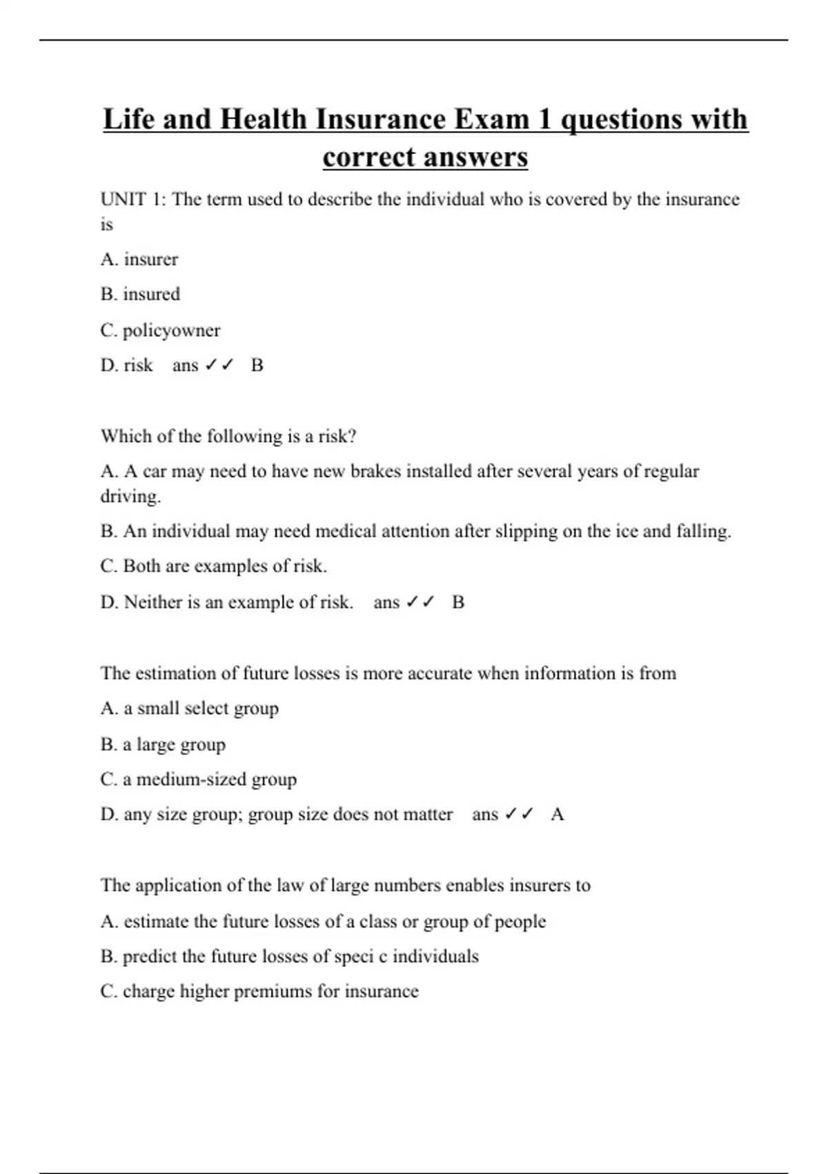 UNIT 1: The term used to describe the individual who is covered by the insurance is A. insurer B. insured C. policyowner D. risk ans B Which of the following is a risk? A. A car may need to have new brakes installed after several years of regular driving. B. An individual may need medical attention after slipping on the ice and falling. C. Both are examples of risk. D. Neither is an example of risk. ans B The estimation of future losses is more accurate when information is from A. a small select group B. a large group C. a medium-sized group D. any size group; group size does not matter ans A The application of the law of large numbers enables insurers to A. estimate the future losses of a class or group