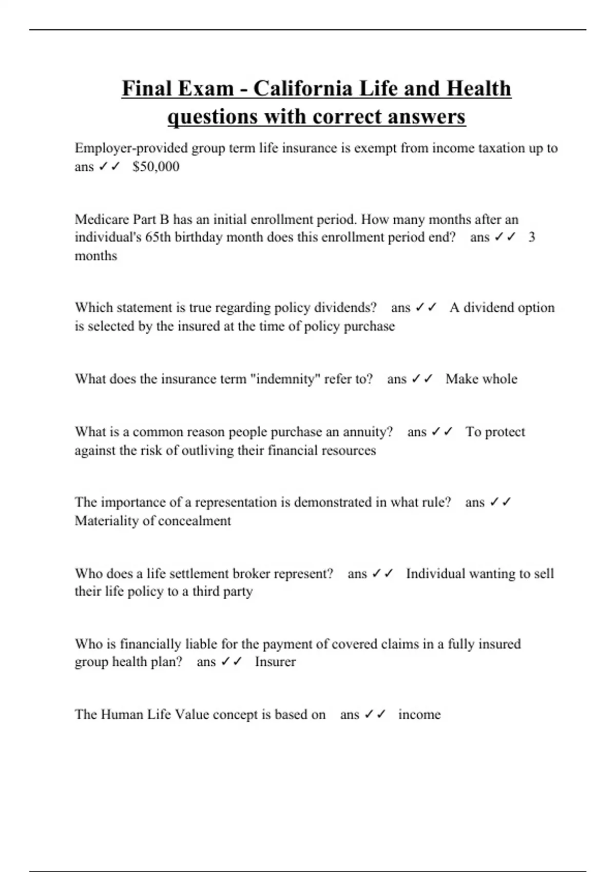 Employer-provided group term life insurance is exempt from income taxation up to ans $50,000 Medicare Part B has an initial enrollment period. How many months after an individual's 65th birthday month does this enrollment period end? ans 3 months Which statement is true regarding policy dividends? ans A dividend option is selected by the insured at the time of policy purchase What does the insurance term "indemnity" refer to? ans Make whole What is a common reason people purchase an annuity? ans To protect against the risk of outliving their financial resources The importance of a representation is demonstrated in what rule? ans Materiality of concealment Who does a life settlement broker represent? ans Individual wanting to sell their life policy to a third party Who is financially liable for the payment of covered claims in a fully insured group health plan? ans Insurer