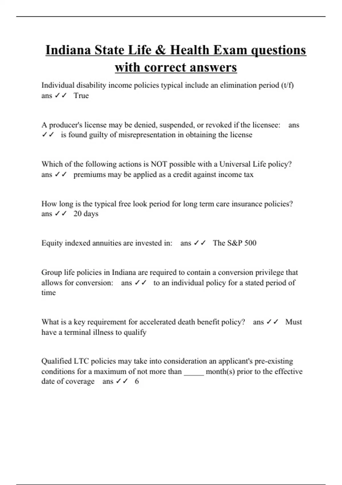Individual disability income policies typical include an elimination period (t/f) ans True A producer's license may be denied, suspended, or revoked if the licensee: ans is found guilty of misrepresentation in obtaining the license Which of the following actions is NOT possible with a Universal Life policy? ans premiums may be applied as a credit against income tax How long is the typical free look period for long term care insurance policies? ans 20 days Equity indexed annuities are invested in: ans The S&P 500 Group life policies in Indiana are required to contain a conversion privilege that allows for conversion: ans to an individual policy for a stated period of time What is a key requirement for accelerated death benefit policy? ans Must have a terminal illness to qualify Qualified LTC policies may take into consideration an applicant's pre-existing conditions for a maximum of not more than _____ month(s) prior to the effective date of coverage ans 6