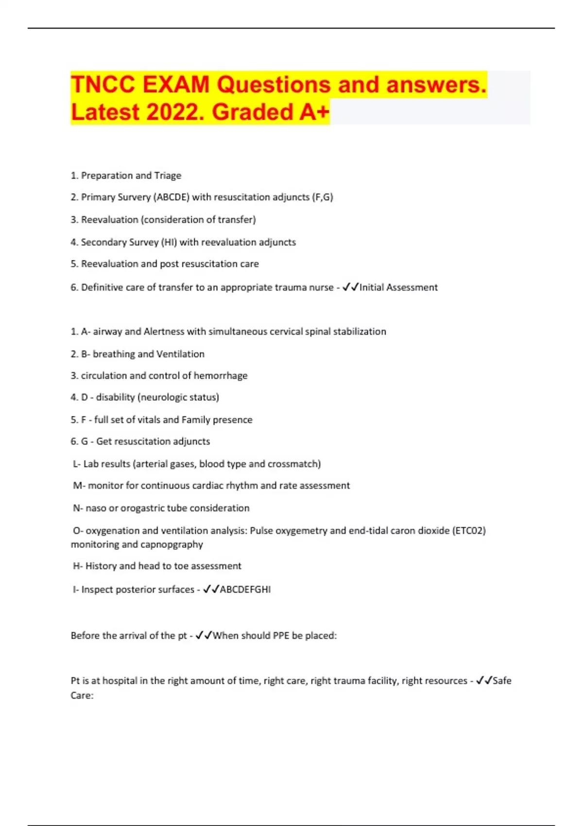 tncc exam questions and answers latest 2022 graded a document content and description below 1 preparation and triage 2 primary survery abcde with resuscitation adjuncts f