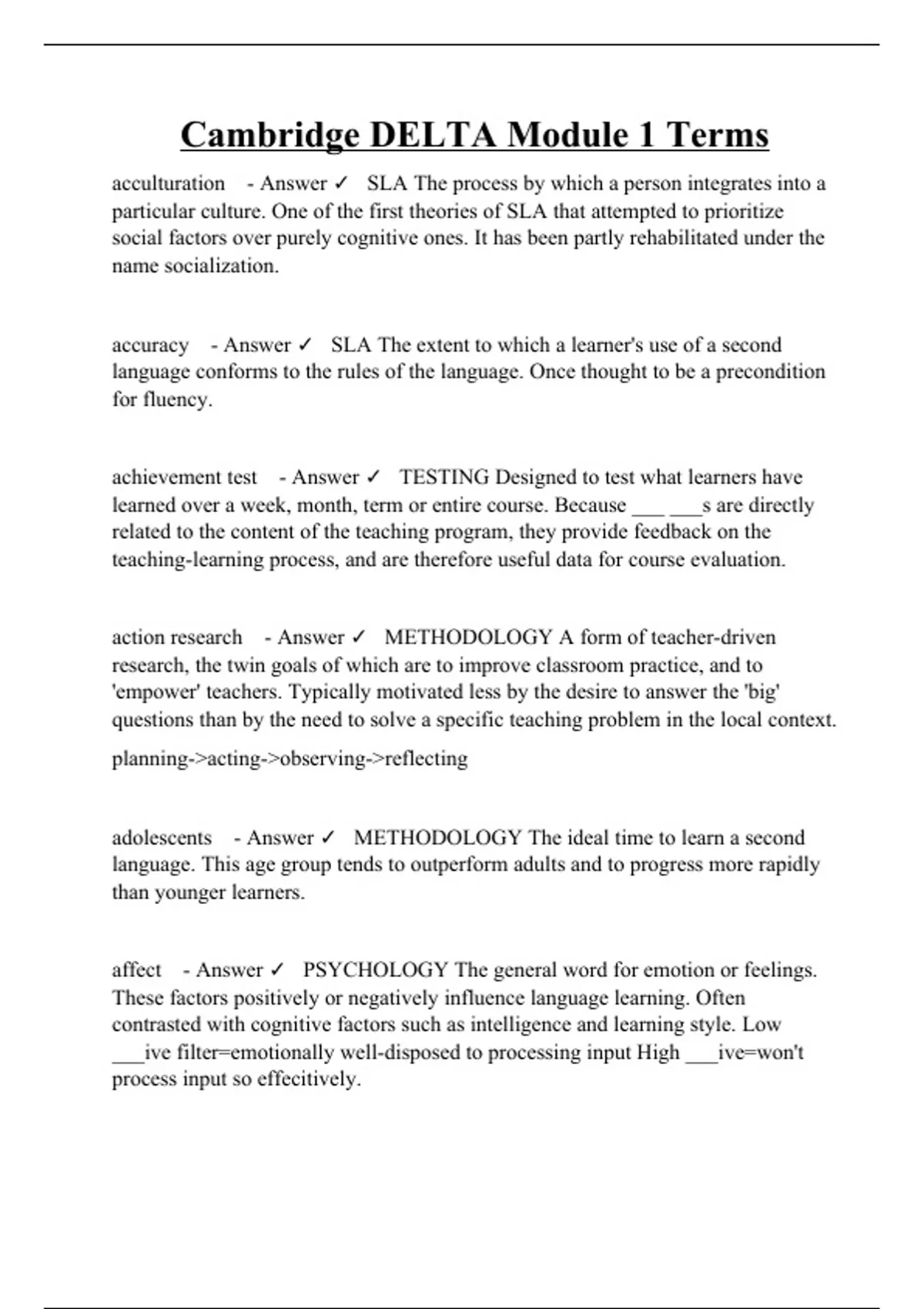 acculturation - Answer SLA The process by which a person integrates into a particular culture. One of the first theories of SLA that attempted to prioritize social factors over purely cognitive ones. It has been partly rehabilitated under the name socialization. accuracy - Answer SLA The extent to which a learner's use of a second language conforms to the rules of the language. Once thought to be a precondition for fluency. achievement test - Answer TESTING Designed to test what learners have learned over a week, month, term or entire course. Because ___ ___s are directly related to the content of the teaching program, they provide feedback on the teaching-learning process, and are therefore useful data for course evaluation. action research - Answer METHODOLOGY A form of teacher-driven research, the twin goals of which are to improve classroom practice, and to 'empower' teachers. Typically motivated less by the desire to answer the 'big' questions than by the need to solve a specific teaching problem in the local context. planning-acting-observing-reflecting adolescents - Answer METHODOLOGY The ideal time to learn a second language. This age group tends to outperform adults and to progress more rapidly than younger learners. affect - Answer PSYCHOLOGY The general word for emotion or feelings. These factors positively or negatively influence language learning. Often contrasted with cognitive factors such as intelligence and learning style. Low ___ive filter=emotionally well-disposed to processing input High ___ive=won't process input so effecitively.