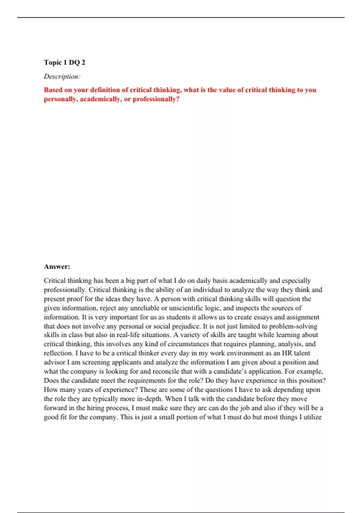 Topic 1 DQ 2 Description: Based on your definition of critical thinking, what is the value of critical thinking to you personally, academically, or professionally?