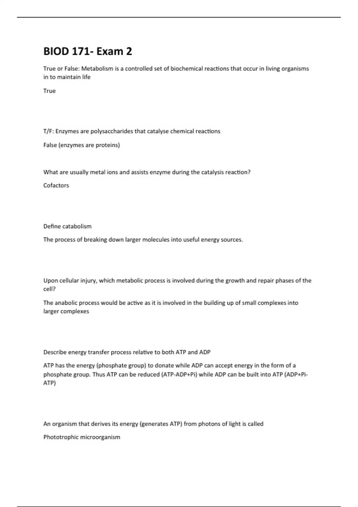 True or False: Metabolism is a controlled set of biochemical reactions that occur in living organisms in to maintain life True T/F: Enzymes are polysaccharides that catalyse chemical reactions False (enzymes are proteins) What are usually metal ions and assists enzyme during the catalysis reaction? Cofactors Define catabolism The process of breaking down larger molecules into useful energy sources. Upon cellular injury, which metabolic process is involved during the growth and repair phases of the cell? The anabolic process would be active as it is involved in the building up of small complexes into