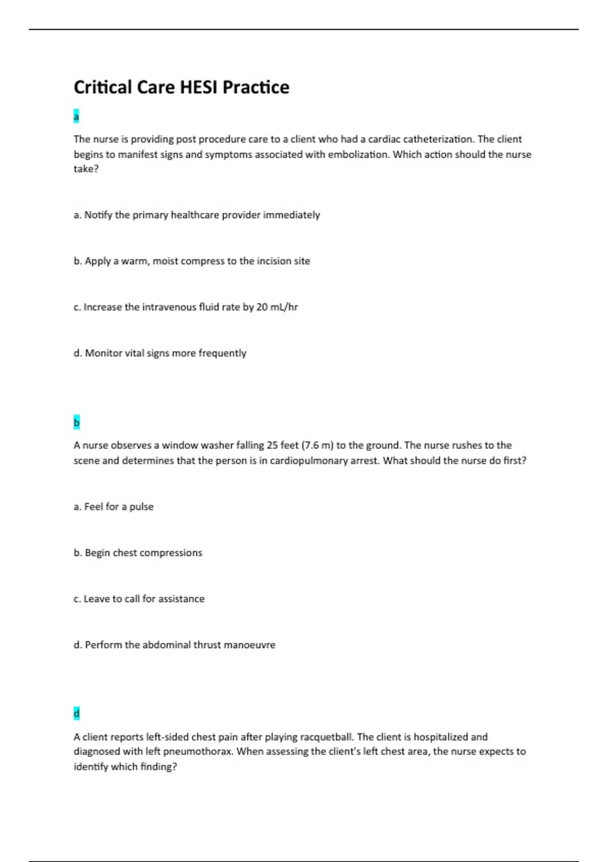 CRITICAL CARE HESI PRACTICE EXAM 2023 APRIL NEW UPDATE QUESTIONS AND ANSWERS