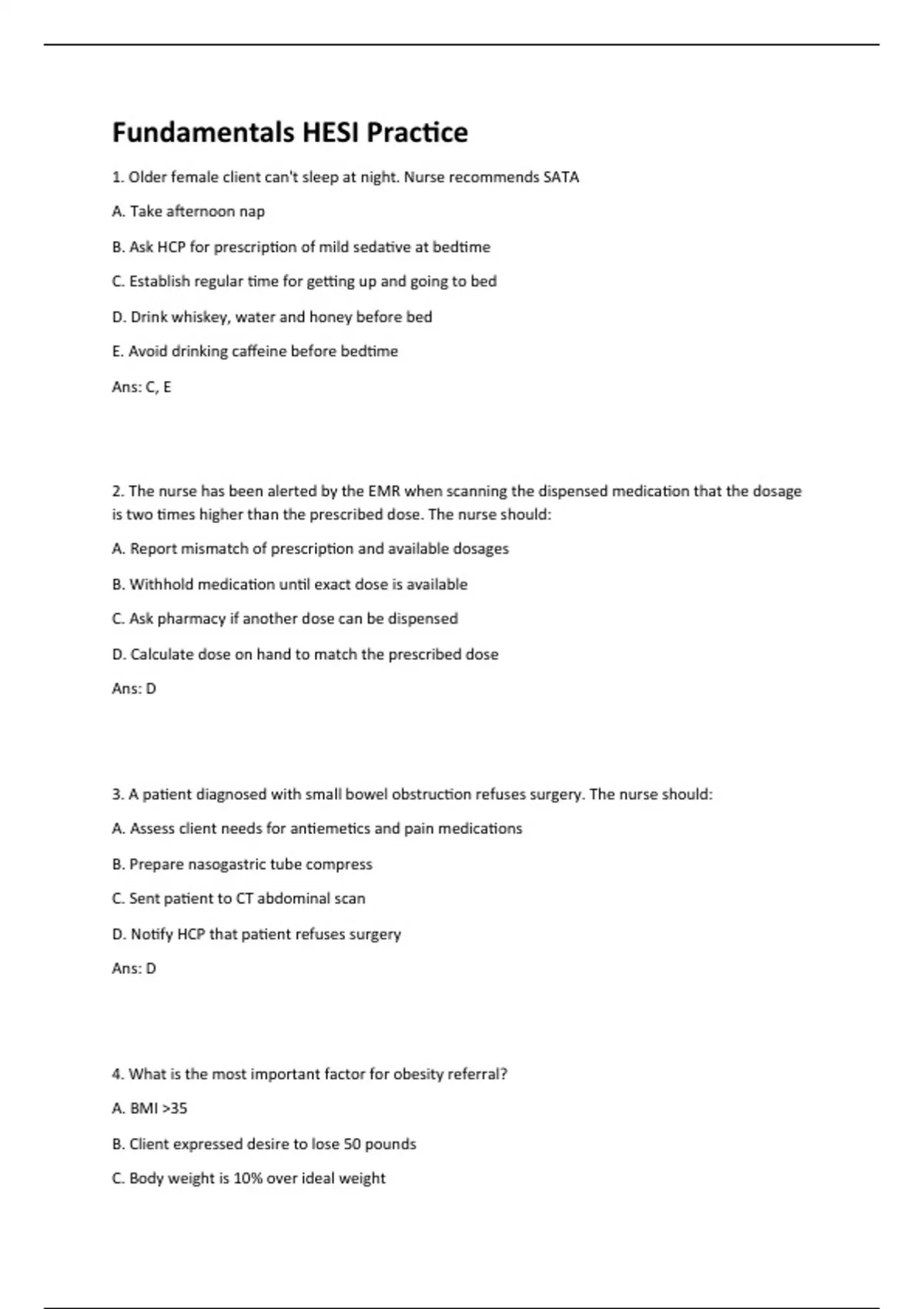 1. Older female client can't sleep at night. Nurse recommends SATA A. Take afternoon nap B. Ask HCP for prescription of mild sedative at bedtime C. Establish regular time for getting up and going to bed D. Drink whiskey, water and honey before bed E. Avoid drinking caffeine before bedtime Ans: C, E