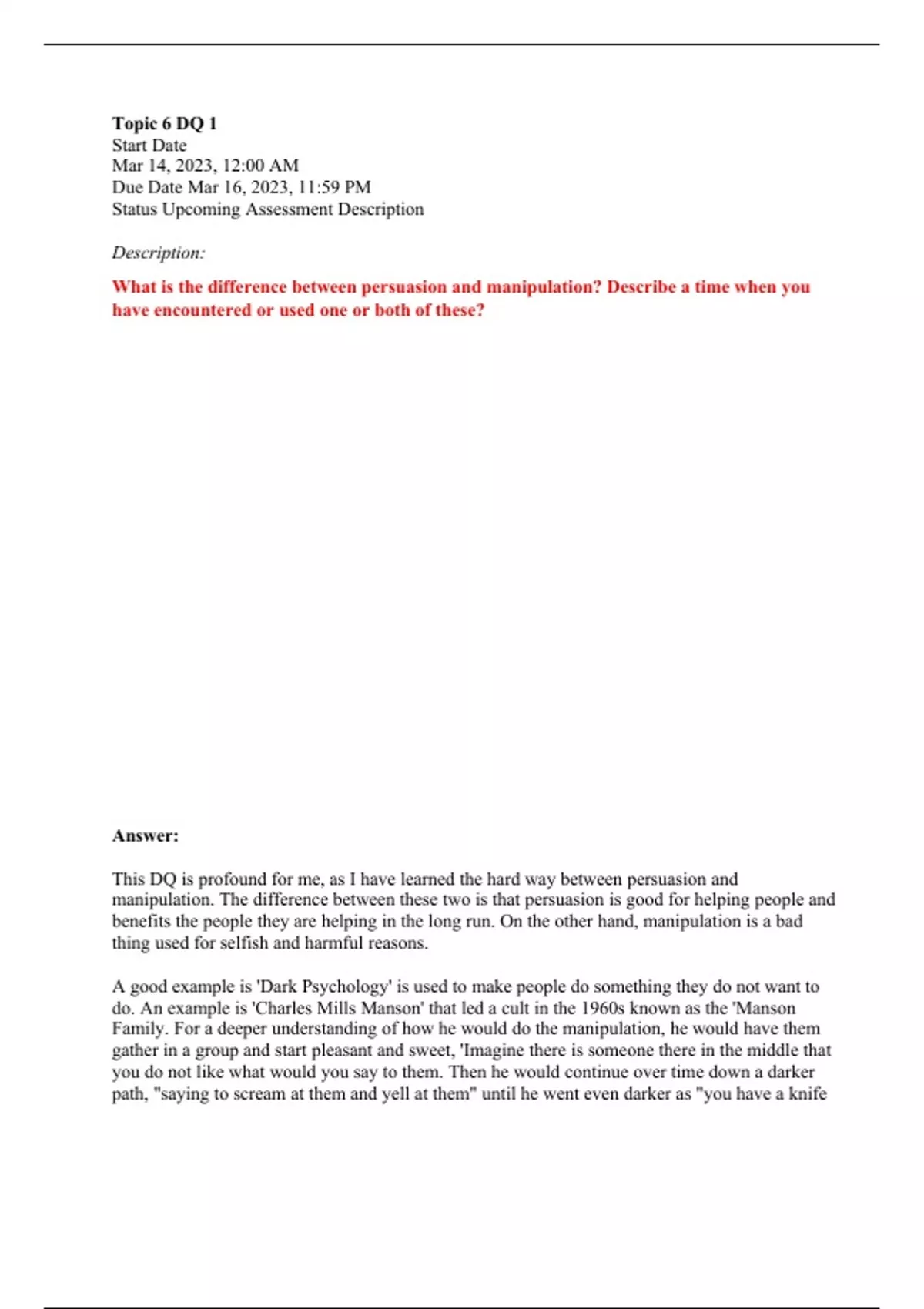 Topic 6 DQ 1 Start Date Mar 14, 2023, 12:00 AM Due Date Mar 16, 2023, 11:59 PM StatusUpcoming Assessment Description Description: What is the difference between persuasion and manipulation? Describe a time when you have encountered or used one or both of these?