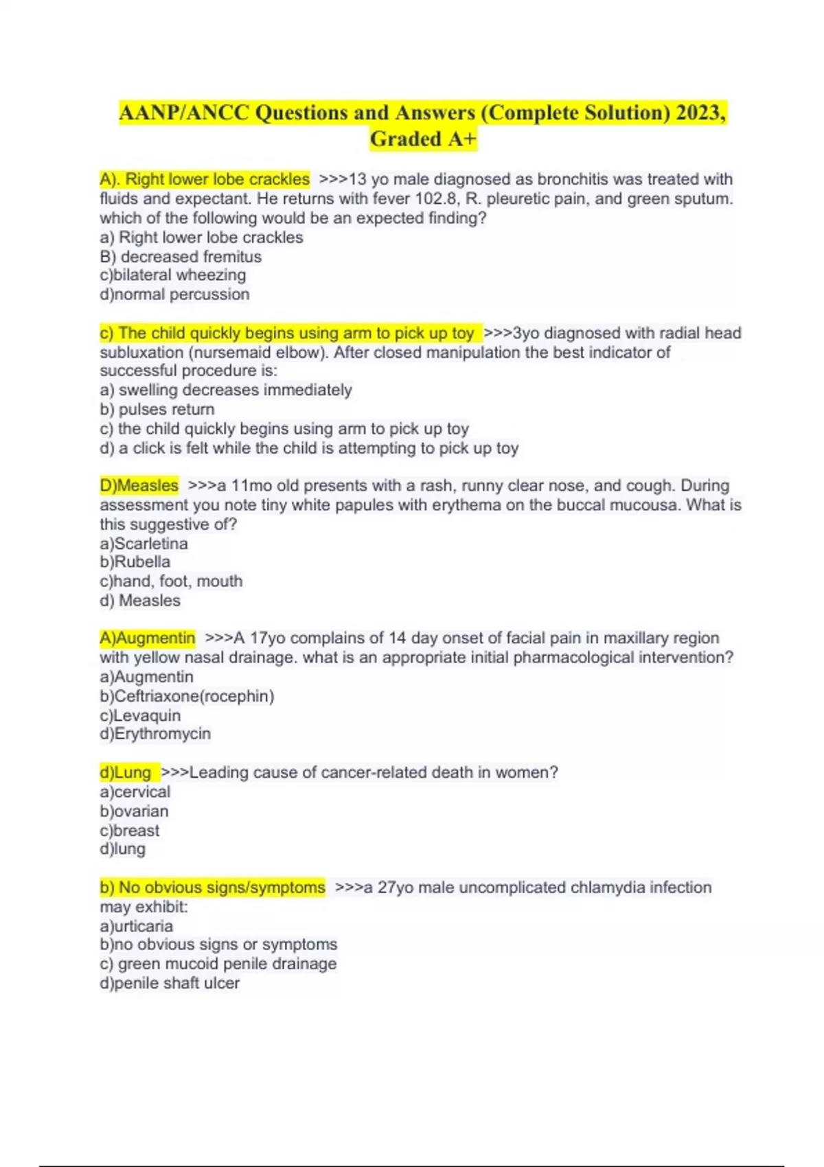 AANP/ANCC Questions and Answers (Complete Solution) 2023, Graded A+. A). Right lower lobe crackles >>>13 yo male diagnosed as bronchitis was treated with fluids and expectant. He returns with fever 102.8, R. pleuretic pain, and green sputum. which of the following would be an expected finding? a) Right lower lobe crackles B) decreased fremitus c)bilateral wheezing d)normal percussion c) The child quickly begins using arm to pick up toy >>>3yo diagnosed with radial head subluxation (nursemaid elbow). After closed manipulation the best indicator of successful procedure is: a) swelling decreases immediately b) pulses return c) the child quickly begins using arm to pick up toy d) a click is felt while the child is attempting to pick up toy D)Measles >>>a 11mo old presents with a rash, runny clear nose, and cough. During assessment you note tiny white papules with erythema on the buccal mucousa. What is this suggestive of? a)Scarletina b)Rubella c)hand, foot, mouth d) Measles A)Augmentin >>>A 17yo complains of 14 day onset of facial pain in maxillary region with yellow nasal drainage. what is an appropriate initial pharmacological intervention? a)Augmentin b)Ceftriaxone(rocephin) c)Levaquin d)Erythromycin d)Lung >>>Leading cause of cancer-related death in women? a)cervical b)ovarian c)breast d)lung b) No obvious signs/symptoms >>>a 27yo male uncomplicated chlamydia infection may exhibit: a)urticaria b)no obvious signs or symptoms c) green mucoid penile drainage d)penile shaft ulcer b)start lower dose then taper up >>>common practice rule to follow with initiating medications in the elderly is: a)prescribe meds to take in am b)start lower dose then taper up c)obtain creatinine clearance for baseline data for those over 70 d)give meds with a full glass of water b) lower the seizure threshold >>>12 yo with PMI of seizure is reported by mother that cold symptoms are present. Denies fever. The NP should advise that a fever may: a)make seizure medication less effective b)lower the seizure threshold c)increase the seizure threshold d) have no effect on the seizure threshold c. doxycyline >>>According to the American Thoracic Society/Infectious Disease Society of American (ATS/IDSA) Consensus guidelines on the Management of Community-Acquired Pneumonia in Adults, which of the following is the most appropriate antimicrobial for tx of CAP in a: 46 y/o well female with a hx of a bilateral tubal ligation who is macrolide intolerant? a. clarithromycin b. amoxicillin c. doxycyline d. fosfomycin c) Doxycycline >>>after a 3 wk camping trip, a 11yo presents with a target lesion with central clearing on the inner left thigh. Chief complaints of headache, fatigue,and generalized muscle pain for several days. What should NP prescribe? a)bactrim b)azithromycin c) doxycycline d) metronidazole b. osteoporosis >>>During development of a treatment plan for a 78 yo with dx hypothyroidism, the NP needs to be concerned with? a)renal insufficiency b)osteoporosis c)dementia d)anemia d)provide reassurance >>>16 yo currently taking ortho-novum 7/7/7 comes to clinic to report midcycle spotting. Denies missing doses and is currently not on any other medications. Which is appropriate? a)modify usage b)double her dose x 2 days c) change to a different medication d) provide reassurance d)prednisone >>>Polymyalgia Rheumatica (PMR) should be managed by: a)whirlpool tub b)celebrex c) analgesic d)prednisone c) Paxil (paroxetine) >>>54yo male c/o malaise as well as delayed ejaculation. Current medications: atenolol, paxil, hctz, claritin. Which med is most likely to cause ED? a)HCTZ b)atenolol c)paxil d) claritin a) palpate structures around shoulder >>>25yo presents with chief complaint of decreased mobility and pain of the right shoulder exacerbated with movement. The patient occupation is painting houses. He reports he recently painted for 24 hours prior to onset of pain. Denies trauma. Passive ROM intact. No visible signs of injury. What should NP do next? a) Palpate structures around shoulder b)obtain MRI c) Order Xray d) Order EMG C. Primary amenorrhea >>>17 yo has never had menses. She is at tanner stage III Physical exam normal with weight appropriate. What is likely diagnosis? a) ovarian dysfunction b) dysmenorrhea c) primary amenorrhea d)secondary amenorrhea a)hemoglobin electrophoresis >>>12 yo patient has a family history of thalessemia and anemia is stage II presentation and a HCT of 330. What should NP order in addition to CBC? a) hemoglobin electrophoresis b) vitamin b12 level c) 25 hr creatinine clearance d) serum folic acid c)strep pneumo >>>Common bacteria responsible for pneumonia in older patients residing in the community is: a) staph aureus b)pseudomonas c)strep pneumo d)tuberculi d) prescribe bulk forming agents & hydrocortisone suppositories >>>43yo c/o 14 day rectal itch &pain. PMI of constipation. Also reports bright red blood on toilet paper several times a week. Rectal exam positive for a single tender, blue, swollen ovoid mass. Guaiac stools negative. What should NP prescribe? a) lomotil b)colonoscopy to r/o cancer c) repeat guaiac test three times and a CBC d) Prescribe bulk forming agents& hydrocortisone suppositories. d) FSH , LH, prolactin &TSH >>>16yo is suspected of having PCOS. In addition to testosterone, the most appropriate diagnostic tests to order: a) BUN,Creatinine,electrolytes &Dhea b) CBC,BUN,creatinine & estrogen c)FBS,CBC,BUN & sex hormone d) FSH,LH,prolactin & TSH b) Metronidazole >>>Which is an example of the typical management of trichomoniasis a)miconazole b)metronidazole c) clindamycin d)azithromycin b)Tamiflu >>>High risk population such as elderly, COPD, or immunocompromised. What should NP prescribe? a) Rest & fluids b) Tamiflu c) amoxicillin d) watch & wait.