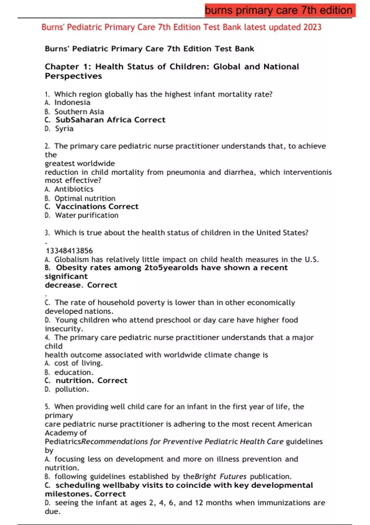 1. Which region globally has the highest infant mortality rate? A. Indonesia B. Southern Asia C. SubSaharan Africa Correct D. Syria 2. The primary care pediatric nurse practitioner understands that, to achieve the greatest worldwide reduction in child mortality from pneumonia and diarrhea, which interventionis most effective? A. Antibiotics B. Optimal nutrition C. Vaccinations Correct D. Water purification 3. Which is true about the health status of children in the United States? . 56 A. Globalism has relatively little impact on child health measures in the U.S. B. Obesity rates among 2to5yearolds have shown a recent significant decrease. Correct . C. The rate of household poverty is lower than in other economically developed nations. D. Young children who attend preschool or day care have higher food insecurity. 4. The primary care pediatric nurse practitioner understands that a major child health outcome associated with worldwide climate change is A. cost of living. B. education. C. nutrition. Correct D. pollution. 5. When providing well child care for an infant in the first year of life, the primary care pediatric nurse practitioner is adhering to the most recent American Academy of PediatricsRecommendations for Preventive Pediatric Health Care guidelines by A. focusing less on development and more on illness prevention and nutrition. B. following guidelines established by theBright Futures publication. C. scheduling wellbaby visits to coincide with key developmental milestones. Correct D. seeing the infant at ages 2, 4, 6, and 12 months when immunizations are due. Chapter 2. Unique Issues in Pediatrics 1. A nurse is explaining the therapeutic milieu to a new nurse. The best explanation of this term would be: 1. The place where the child is receiving care. burns primary care 7th edition Burns' Pediatric Primary Care 7th Edition Test Bank latest updated 2023 2. Group therapy. 3. Personal interactions between patients and staff. 4. All of the above are correct. ANS: 4 2. A 16-year-old male has received a pink-slip from the police for inpatient psychiatric treatment. The teen has been expressing thoughts of hanging himself because Life sucks. Thenursing staff should consider placing the child: 1. With peers. 2. In an area where he can be watched one-on-one. 3. With aroommate thatisexpressing the sameconcerns. 4. In an area close to an external door. ANS: 2 3. Learning disabilities in children have scientifically been linked to: 1. Poornutrition. 2. The environment in which the child lives. 3. Genetics. 4. Watching more than four hours of television a day. ANS: 3 4. A mental health nurse has assessed a child and determined that the child exhibits behavioral challenges. When the school nurse explains this to a teacher, the best description wouldbe: . 1. The child may exhibit physical outbursts. 2. The child may exhibit violence toward others. 3. The child may be defiant or have tantrums. 4. The child will need special interventions for learning. ANS: 3 5. A child that has not exhibited enuresis in four years has exhibited this behavior pattern for the last week. The reason a child may revert back to this behavior pattern is because of: 1. Hallucinations. 2. Behavioral challenges. 3. Delusions. 4. Stress. ANS: 4 6. An 18-year-old male has called the crisis line for help. The crisis nurse recognizes the intervention needs may consist of all of the following except: 1. Discussing the individuals everyday activities. 2. Recognizing that the patient may be in a catharsis state. 3. Expressing empathy toward the caller. 4. Avoiding entropy. ANS: 1 7. An 8-year-old boy with a history of hallucinations and violent behavior has been place in a seclusion room at the hospital because he has been hurting others. The nurse checks on the patient and realizes she must take him out of the seclusion room when: 1. He is crying to be released. Burns' Pediatric Primary Care 7th Edition Test Bank latest updated 2023 2. He states, I will be a good boy now. . 3. He starts headbutting the window. 4. He complains that his parents will file a lawsuit. ANS: 3 8. A child has been exhibiting the MacDonald Triad. These behaviors include: 1. Enuresis, pushing others, and pyromania. 2. Swinging a cat by the tail, bed-wetting, and lighting paper on fire in the trash can. 3. Playing with other children, laughing, and conversing with adults. 4. Playing with a campfire, watching television, and seeking adult attention. ANS: 2 9. A teenager diagnosed with borderline personality disorder should have discharge planning instructions of: 1. A consistent caregiver. 2. Monitoring of media, such as the Internet, television, and video games. 3. Obtaining support from family and friends. 4. Seeking medical attention when the teenager feels good. ANS: 3 10. A mental health nurse is teaching the mother of a child with executive functioning issues ways to help her child. Interventions the mother should use include: 1. Placing visual aids on the bathroom mirror so that the child will follow the morning routine. 2. Give the child a choice in foods to eat. 3. Allowing the child to ask for help when needed. 4. Reminding the child to be nice to others. ANS: 1
