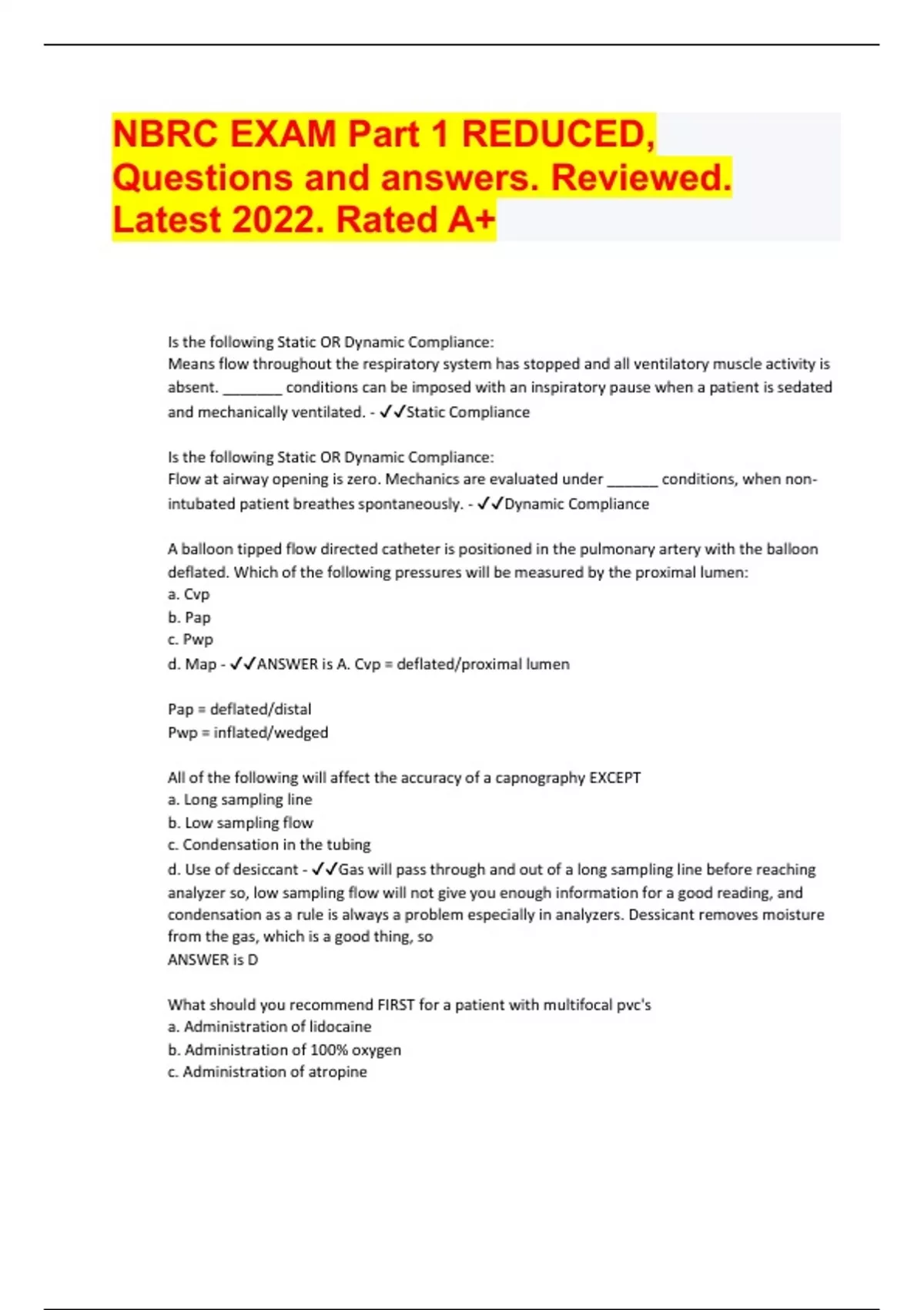 NBRC EXAM Part 1 REDUCED, Questions and answers. Reviewed. Latest 2022. Rated A+ Document Content and Description Below Is the following Static OR Dynamic Compliance: Means flow throughout the respiratory system has stopped and all ventilatory muscle activity is absent. _______ conditions can be imposed with an inspir atory pause when a patient is sedated and mechanically ventilated. - Static Compliance Is the following Static OR Dynamic Compliance: Flow at airway opening is zero. Mechanics are evaluated under ______ conditions, when non-intubated patient breathes spontaneously. - Dynamic Compliance A balloon tipped flow directed catheter is positioned in the pulmonary artery with the balloon deflated. Which of the following pressures will be measured by the proximal lumen: a. Cvp b. Pap c. Pwp d. Map - ANSWER is A. Cvp = deflated/proximal lumen Pap = deflated/distal Pwp = inflated/wedged All of the following will affect the accuracy of a capnography EXCEPT a. Long sampling line b. Low sampling flow c. Condensation in the tubing d. Use of desiccant - Gas will pass through and out of a long sampling line before reaching analyzer so, low sampling flow will not give you enough information for a good reading, and condensation as a rule is always a problem especially in analyzers. Dessicant removes moisture from the gas, which is a good thing, so ANSWER is D What should you recommend FIRST for a patient with multifocal pvc's a. Administration of lidocaine b. Administration of 100% oxygen c. Administration of atropine d. Administration of epinephrine - Multiple pvc's coming from multiple locations (multifocal) is a real problem and you should administer oxygen FIRST, so ANSWER is B. lidocaine will help reduce irritability of heart and help with pvc's but would not be first option, atropine is used for bradycardia and cardiac irregularities but not pvc's, epinephrine is emergency drug not for pvc's but more for pulseless ventricular tachycardia or ventricular fibrilation where heart is not responding . What is the normal range for the mean pulmonary artery pressure in an adult a. 2-6 mm Hg b. 4-12 mmHg c. 9-18 mmHg d. 21-28 mmHg - Mean pulmonary artery pressure in an adult should be in the teens so best ANSWER is C A patient in the emergency dept has frothy secretions, moist crackles, and tachypnea. The patient has marked dyspnea and a history of heart disease. Which of the following should the respiratory therapist recommend. on immediately ister 100% oxygen in Fowlers position ister furosemide - This is an emergency, they are having heart problems, dyspnea, frothy secretions indicating severe pulmonary edema, etc. so 100% oxygen immediately, having the patient in the Fowlers position (an upright position) will help pull fluid down away from the lungs, furosemide is a lasix (loop diuretic) which gets rid of excess fluid. You do NOT suction someone with frothy secretions and heart problems, this just delays appropriate therapy. So ANSWER is 2,3,4 Which of the following will determine aortic pulse pressure. a. systolic + systolic + diastolic/3 b. diastolic + pulse pressure/3 c. systolic pressure - diastolic pressure d. stroke volume x heart rate x 10. - Aortic pulse pressure is just the difference between systolic and diastolic pressure, so ANSWER is C What is the normal range for the pulmonary artery systolic pressure in an adult? A. 2-6 mm Hg B. 4-12 mm Hg C. 9-18 mm Hg D. 21-28 mm Hg - The normal pressure is 25 mm Hg, so the ANSWER is D 21-28 mm Hg A multiple trauma victim with internal hemorrhage is being monitored via pulse oximetry. Which of the following conditions would affect the accuracy of her SpO2 readings? A. hypotension B. hyperoxia C. hypocarbia D. hyperthermia - Since the SpO2 measures the color of the blood and the ability to shine a light through the blood, the only answer that would affect the accuracy of the SpO2 reading would be ANSWER A hypotension because hypotension causes less profusion (needed for the SpO2 reading) The respiratory therapist notices a dampened waveform on a pulmonary arterial line. The therapist's first action should be to A. attempt to draw blood from the line. B. check the transducer dome for air bubbles. C. flush the catheter with heparin solution. D. check the position of the transducer. - Dampened wave form is when you aren't getting a nice sharp reading, you should get a clear systolic and diastolic pattern; the most common cause is a blood clot, flushing the catheter with heparin might push the blood clot into the lung at this point (not a good idea), another common cause of a dampened wave form is air bubbles in the transducer dome, so the ANSWER is B. A patient in the intensive care unit is suffering left heart failure. Which of the following drugs will increase the strength of contraction and improve cardiac output? A. digitalis B. atropine C. isuprel D. lidocaine - Atropine is used for bradycardia and increases output but not strength, Isuprel treats bradycardia and output but not strength, Lidocaine reduces irritability of heart, but Digitalis is a cardiac glycoside that increases cardiac output and strengthens cardiac contraction, so ANSWER is A The respiratory therapist has been paged to the ICU to assist in the treatment of a 98 kg (215 lb) man. The patient is pale, diaphoretic, and suddenly loses consciousness. No palpable pulse or blood pressure is measured. The ECG monitor displays the following sinus bradycardia with a rate of 45): The respiratory therapist should: A. confirm the ECG in another lead. B. begin chest compressions. C. perform cardioversion. D. perform defibrillation. - ECG is showing sinus bradycardia with a rate of 45, all this leads up to begin chest compressions, so ANSWER is B. Do not perform cardioversion or defribulation because there is no arrhythmia so we don't want to mess with anything electrical in the heart, just want to help it out mechanically. The respiratory therapist is assessing a patient's vital signs a