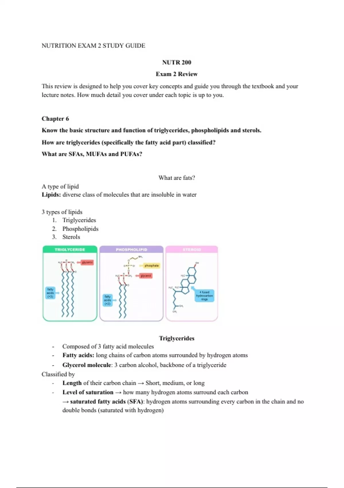 Know the basic structure and function of triglycerides, phospholipids and sterols.