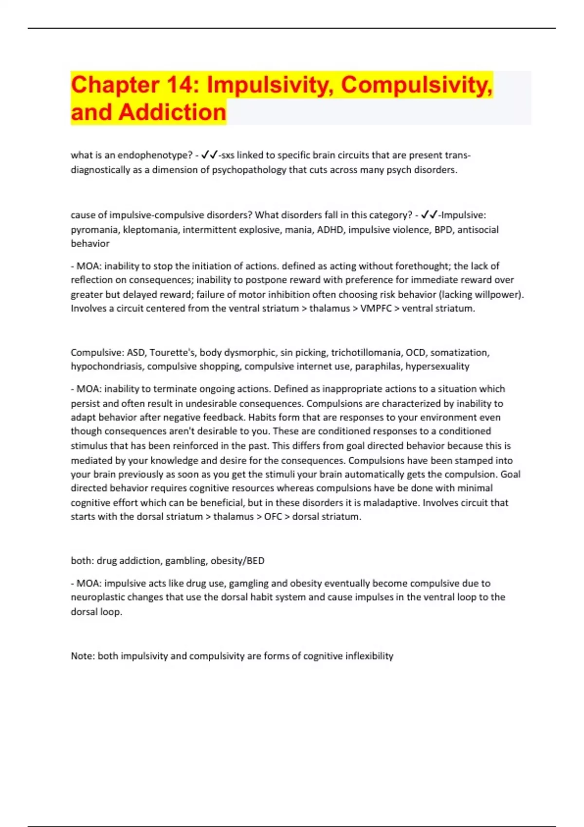 Chapter 14: Impulsivity, Compulsivity, and Addiction. Questions with 100% accurate answers. Document Content and Description Below what is an endophenotype? - -sxs linked to specific brain circuits that are present trans-diagnostically as a dimension of psychopathology that cuts across many psych disorders. cause of impu lsive-compulsive disorders? What disorders fall in this category? - -Impulsive: pyromania, kleptomania, intermittent explosive, mania, ADHD, impulsive violence, BPD, antisocial behavior - MOA: inability to stop the initiation of actions. defined as acting without forethought; the lack of reflection on consequences; inability to postpone reward with preference for immediate reward over greater but delayed reward; failure of motor inhibition often choosing risk behavior (lacking willpower). Involves a circuit centered from the ventral striatum > thalamus > VMPFC > ventral striatum. Compulsive: ASD, Tourette's, body dysmorphic, sin picking, trichotillomania, OCD, somatization, hypochondriasis, compulsive shopping, compulsive internet use, paraphilas, hypersexuality - MOA: inability to terminate ongoing actions. Defined as inappropriate actions to a situation which persist and often result in undesirable consequences. Compulsions are characterized by inability to adapt behavior after negative feedback. Habits form that are responses to your environment even though consequences aren't desirable to you. These are conditioned responses to a conditioned stimulus that has been reinforced in the past. This differs from goal directed behavior because this is mediated by your knowledge and desire for the consequences. Compulsions have been stamped into your brain previously as soon as you get the stimuli your brain automatically gets the compulsion. Goal directed behavior requires cognitive resources whereas compulsions have be done with minimal cognitive effort which can be beneficial, but in these disorders it is maladaptive. Involves circuit that starts with the dorsal striatum > thalamus > OFC > dorsal striatum. both: drug addiction, gambling, obesity/BED - MOA: impulsive acts like drug use, gamgling and obesity eventually become compulsive due to neuroplastic changes that use the dorsal habit system and cause impulses in the ventral loop to the dorsal loop. Note: both impulsivity and compulsivity are forms of cognitive inflexibility OCD related spectrum disorders - -OCD Hair pulling (trichotillomania) Skin picking Body dysmorphic disorder Hoarding Tourette's/tic disorder ASD Hypochondriasis Somatization Substance/behavioral addictions - -Drug Gambling Internet Food Shopping Disruptive/impulse control disorders - -Pyromania Kleptomania Intermittent explosive Impulsive violence BPD Self harm/parasuicidal behavior Antisocial behavior CD ODD Mania ADHD Sexual disorders - -Hypersexual Paraphilias why can't impulsive-compulsive disorders be stopped? - -The problem is in the cortical circuits that normally suppress these behaviors. Impulsivity starts in the ventral striatum, compulsivity starts in the dorsal striatum. Usually the PFC suppresses these drives (willpower). So both could be a result of relaxation of this control by the PFC. Or they could be a result of too much pressure (stimuli) from the bottom up (ventral striatum or dorsal striatum). anatomically: impulsivity is an action outcome that's a ventrally dependent learning system. Compulsivity is a habit system that is a dorsally dependent learning system. Many behaviors start as impulses in the ventral loop of reward and motivation and then over time migrate dorsally due to neuroadaptions and neuroplasticity that form a habit which becomes compulsive. Going from 1 loop to another involves regulatory input from the hippocampus and amygdala (possibly why those with PTSD have higher addiction rates). - if you look at drug addiction it starts ventral and goes dorsal. The initial use is voluntary which is linked to impulsive personality traits but as they abuse the drug they lose control over drug seeking and taking behavior which becomes compulsive. The impulsive to take a drug initially gives a high but if this doesn't happen frequent enough there is a lack of triggering neuroplastic cascades from ventral to dorsal and this will remain under your control (you are occasionally bad). But if the impulsive drug use is repeated too often then it becomes a compulsion to reduce the sxs of withdrawal. The pleasure that using initially causes reduces over time requiring increased doses or more frequency. High impulsivity predisposes someone to develop compulsions quicker (switching over to habit learning loop quicker, if they have accelerated habit formation they may be at risk for addiction). Once you have a compulsion you are like Pavlov's dogs with an involuntary conditioned compulsion with willpower inadequate to interrupt destructive perseverations of the behavior (a compulsion). what is rebound? - -the exaggerated expression of the original condition that some pts experience right after cessation of an effective tx. Explain the mesolimbic DA circuit as pathway of reward - -Drugs that cause addition increase DA in the ventral striatum (NA). The mesolimbic DA pathway is overly active in addiction causing too much DA (interestingly this is also the case in schizophrenia and may be the reason for high comorbid SUD in schizophrenia). When you get natural highs (from accomplishments or sex) your body releases endorphins, anandamide (brains own marijuana), ACH (brains own nicotine), and DA (brains own cocaine and amphetamine). Drugs of abuse use the mesolimbic pathway to release DA to amounts not possible naturally. Impulsive-compulsive