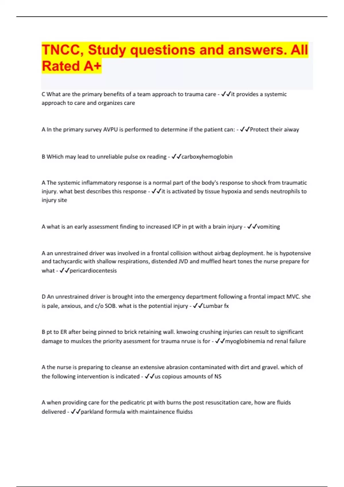 TNCC, Study questions and answers. All Rated A+ Document Content and Description Below C What are the primary benefits of a team approach to trauma care - it provides a systemic approach to care and organizes care A In the primary survey AVPU is performed to determine if the pat ient can: - Protect their aiway B WHich may lead to unreliable pulse ox reading - carboxyhemoglobin A The systemic inflammatory response is a normal part of the body's response to shock from traumatic injury. what best describes this response - it is activated by tissue hypoxia and sends neutrophils to injury site A what is an early assessment finding to increased ICP in pt with a brain injury - vomiting A an unrestrained driver was involved in a frontal collision without airbag deployment. he is hypotensive and tachycardic with shallow respirations, distended JVD and muffled heart tones the nurse prepare for what - pericardiocentesis D An unrestrained driver is brought into the emergency department following a frontal impact MVC. she is pale, anxious, and c/o SOB. what is the potential injury - Lumbar fx B pt to ER after being pinned to brick retaining wall. knwoing crushing injuries can result to significant damage to muslces the priority asessment for trauma nruse is for - myoglobinemia nd renal failure A the nurse is preparing to cleanse an extensive abrasion contaminated with dirt and gravel. which of the following intervention is indicated - us copious amounts of NS A when providing care for the pedicatric pt with burns the post resuscitation care, how are fluids delivered - parkland formula with maintainence fluidssB thinning skin and diminished autonomic response in older adult can have what effect on primary assessment - compromised thermoregulation A in mass casualty "doing the greatest good for the greatest number of people refers to a situation where - there may be more patients than resources C effective pain management in hte pt iwth rib fxwill promote what - cough with ability to clear secretions Bduring the primary survery which of the following has the greatest priority - cervical spine injury D restrained driver is involved in a severe head on MVC and presnts with a seatbelt mark along the neck and upper chest area. bilateral decreased breath sounds, hemoptysis and diffuse sub q emphysemato the neck