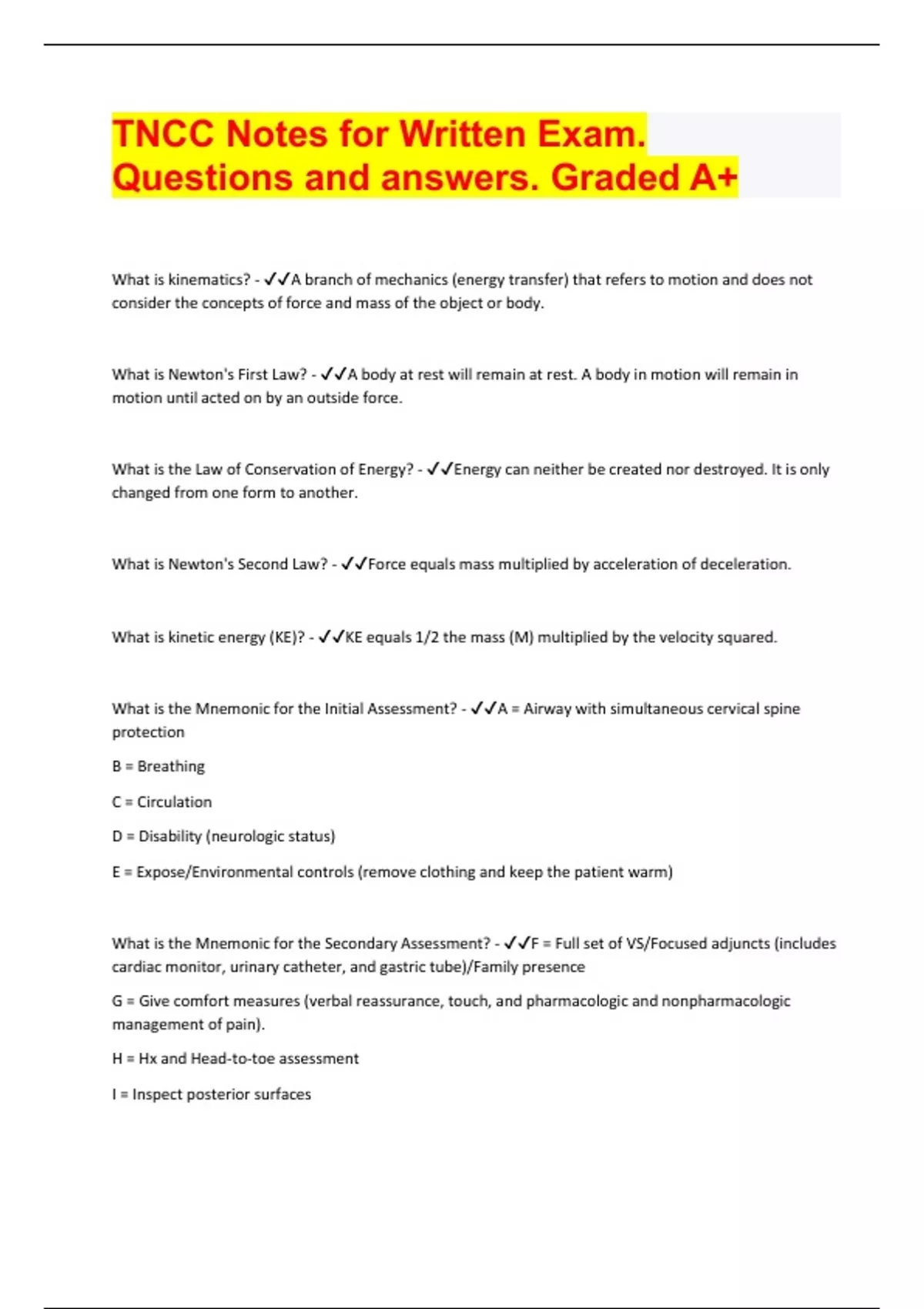 TNCC Notes for Written Exam. Questions and answers. Graded A+