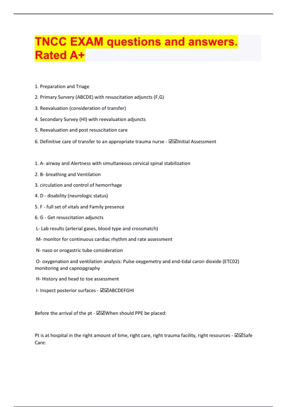 TNCC EXAM questions and answers. Rated A+ Document Content and Description Below . Preparation and Triage 2. Primary Survery (ABCDE) with resuscitation adjuncts (F,G) 3. Reevaluation (consideration of transfer) 4. Secondary Survey (HI) with reevaluation adjuncts 5. Reevaluatio n and post resuscitation care 6. Definitive care of transfer to an appropriate trauma nurse - ☑☑Initial Assessment 1. A- airway and Alertness with simultaneous cervical spinal stabilization 2. B- breathing and Ventilation 3. circulation and control of hemorrhage 4. D - disability (neurologic status) 5. F - full set of vitals and Family presence 6. G - Get resuscitation adjuncts L- Lab results (arterial gases, blood type and crossmatch) M- monitor for continuous cardiac rhythm and rate assessment N- naso or orogastric tube consideration O- oxygenation and ventilation analysis: Pulse oxygemetry and end-tidal caron dioxide (ETC02) monitoring and capnopgraphy H- History and head to toe assessment I- Inspect posterior surfaces - ☑☑ABCDEFGHI Before the arrival of the pt - ☑☑When should PPE be placed: Pt is at hospital in the right amount of time, right care, right trauma facility, right resources - ☑☑Safe Care:Uncontrolled Hemorrhage - ☑☑Major cause of preventable death: reorganize care to C-ABC - ☑☑If uncontrolled hemorrhage .. Used at the beginning of the initial assessment 1. A Alert. If the pt is alert he or she will be able to maintain his or her airway once it is clear. 2. V responds to verbal stimuli responds to pain. If the patient needs verbal stimulation to respond, an airway adjunct may be needed to keep the tongue from obstructing the airway. 3. P responds to pain. If the pt. responds only to pain, he or she may not be able to maintain his or her airway adjunct may need to be placed while further assessment is made to determine the need for intubation. 4. U Unresponsive. If the pt. is unresponsive, announce it loudly to the team and direct someone to chk in the pt is pulseless while assessing if the cause of the problem is the airway. - ☑☑Airway and AVPU: ask pt to pen his or her mouth - ☑☑While assessing airway the patient is alert and responds to verbal stimuli you should.. jaw thrust maneuver to open airway and assess for obstruction. If pt has a suspected csi, the jaw thrust procedure should be done by two providers. One provider can maintain c-spine and the other can perform the jaw thrust maneuver. - ☑☑While assessing airway pt is unable to open mouth, responds only to pain, or is unresponsive you should.. 1. The tongue obstructing the airway 2. loose or missing teeth 3. foreign objects 4. blood, vomit, or secretions' 5. edema 6. burns or evidence of inhalation injuryAuscultiate or listen for: 1. Obstructive airway sounds such as snoring or gurgling 2. Possible occlusive maxillofacial bony deformity 3. Subcutaneous emphysema - ☑☑Inspect the mouth for: 1. Check the presence of adequate rise and fall of the chest with assisted ventilation 2. Absence of gurgling on auscultation over the epigastrium 3. Bilateral breath sounds present on auscultation 4. Presence of carbon dioxide (CO2) verified by a CO2 device or monitor - ☑☑If the pt has a definitive airway in what should you do? 1. Suction the airway 2, Use care to avoid stimulating the gag reflex 3. If the airway is obstructed by blood or vomitus secretions, use a rigid suction device If foreign body is noted, remove it carefully with forceps or another appropriate method - ☑☑If Airway is not patent 1. Apnea 2. GCS 8 or less 3. Maxillary fractures 4. Evidence of inhalation injury (facial burns) 5. Laryngeal or tracheal injury or neck hematoma 6. High risk of aspiration and patients inability to protect the airway 7. Compromised or ineffective ventilation - ☑☑Following conditions might require a definitive airway Breathing: To assess breathing expose the chest: 1. Inspect for a. spontaneous breathing b. symmetrical rise and fallc. depth, pattern, and rate of respiration d. signs of difficulty breathing such as accessory muscle use e. skin color (normal, pale, flushed, cyanotic) f. contusions, abrasions, deformities (flail chest) g. open pneumothoraces (sucking chest wounds) h. JVD i. signs of inhalation injury (singed nasal hairs, carbonaceous sputum) - ☑☑B tracheal deviation and jvd - ☑☑Late signs of tension pneumo: 1. equal breath sounds bilaterally at the second intercostal space midclavicular line and the bases for fifth intercostal space at the axillary line - ☑☑Auscultate the chest for: 1. bony fractures and possible rib fractures, which may impact ventilation 2. palpate for crepitus 3. subcutaneous emphysema which may be a sign for a pneumothorax 4. soft tissue injury - ☑☑Palpate the chest for 1. open the airway, use jaw thrust 2. insert an oral airway 3. assist ventilations with a bag mask 4. prepare for definitive airway - ☑☑If breathing is absent.. trauma its need early supplemental oxygen, start with 15 mL O2 and titrate oxygen delivery. - ☑☑Oxygen on trauma patients Circulation and Control of Hemorrhage Inspect first for any uncontrolled bleedingSkin color palpate for central pulses - carotid and femoral - rate, rhythm, and strength Skin temp: cool, diaphoretic, or warm and dry - ☑☑C apply direct pressure to bleeding elevate extremity apply pressure over arterial sites Consider a pelvic binder for pelvic fractures consider a tourniquet cannulate two veins with large caliber IV - if unable to gain assess consider IO a. obtain labs, type and cross b. infuse warm isotonic fluids c. consider balanced resuscitation d. use rapid infusion device - ☑☑C Interventions: Disability - Neurologic Status 1. Assess pupils for equality, shape, and reactivity (PERRL) 2. Assess GCS (eye opening, verbal response, and motor response) - ☑☑D 1.