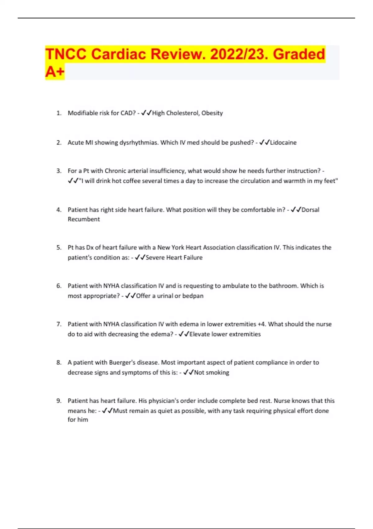 TNCC Cardiac Review. 2022/23. Graded A+ Document Content and Description Below Modifiable risk for CAD? - High Cholesterol, Obesity 2. Acute MI showing dysrhythmias. Which IV med should be pushed? - Lidocaine 3. For a Pt with Chronic arterial insufficiency, what wo uld show he needs further instruction? - "I will drink hot coffee several times a day to increase the circulation and warmth in my feet" 4. Patient has right side heart failure. What position will they be comfortable in? - Dorsal Recumbent 5. Pt has Dx of heart failure with a New York Heart Association classification IV. This indicates the patient's condition as: - Severe Heart Failure 6. Patient with NYHA classification IV and is requesting to ambulate to the bathroom. Which is most appropriate? - Offer a urinal or bedpan 7. Patient with NYHA classification IV with edema in lower extremities +4. What should the nurse do to aid with decreasing the edema? - Elevate lower extremities 8. A patient with Buerger's disease. Most important aspect of patient compliance in order to decrease signs and symptoms of this is: - Not smoking 9. Patient has heart failure. His physician's order include complete bed rest. Nurse knows that this means he: - Must remain as quiet as possible, with any task requiring physical effort done for him10. An old term defined as the condition in which the patient suffers peripheral or pulmonary congestion is called: - Congestive Heart Failure 11. Patient with infective endocarditis. Nurse identifies the nursing diagnosis of activity intolerance related to generalized weakness for him. Which intervention does the nurse plan while he is febrile? - Decreased activity 12. Patient with a history of dysrhythmias is to wear a Holter monitor. Nurse should explain that Holter monitoring: - Is a portable EKG device 13. After flu-like illness, patient complains of chills and small petechiae in his mouth and legs. A heart murmur is detectable. These are characteristic signs of: - Infective Endocarditis 14. The patient achieves comfort in breathing only when he assumes a sitting position. During the charting of this position, the nurse can describe this as: - Orthopnea 15. What is defined as a distended dilated segment of an artery? - Aneurysm 16. A patient is admitted with a diagnosis of possible aortic aneurysm. In assessing her, it is most important to monitor her: - Blood pressure 17. A patient, age 65, has chronic angina pectoris. Her daughter had questions about the proper use of nitro for pain management. She was unsure about how many times she should take nitro for an episode of angina. The best reply of the nurse is: - "If the pain isn't relieved after 3 doses of nitro at 5-min intervals, call the doctor and come back to the hospital" 18. Patient has been hospitalized for CHF three times in the last 4 months. While preparing the discharge teaching plan, the nurse assesses that he doesn't comply with his medication regimen. The nurses immediate action is: - Collect more info to identify his reasons for noncompliance 19. Dependent edema of the extremities, enlargement of the liver, oliguria, jugular vein distension, and abdominal distension are s/s of: - Right-Sided Heart Failure20. A patient with newly diagnosed HTN tells nurse he uses alot of salt on his foods and has not been able to lose 30 lbs that he has gained in last 10 years. He doesn't understand why he as HTN since he's not an anxious person. Which nursing diagnosis does the nurse identify for this patient? - Ineffective health maintenance related to lack of knowledge of disease process and management 21. A patient, 72, was admitted to the medical unit with a diagnosis of angina pectoris. Characteristic s/s of angina pactoris include: - Substernal pain that radiates down the left arm 22. 56 y/o patient was admitted to the emergency room with an MI. Cardiac enzymes were drawn. In a patient with an MI, which lab values would be abnormal? - Elevated levels of serum glutamic oxaloacetic transaminase (SGOT) (AST), Creatine phosphokinase (CPK-MB), and Lactic dehydrogenase (LDH), Troponin 1 23. Patient, Age 26,is hospitalized with cardiomyopathy. While obtaining a nursing Hx from her, the nurse sees that increased incidence of cardiomyopathy in young adults who have minimal ris factors for heart disease is related to: - Cocaine use 24. Restlessness, diaphorisis, severe dyspnea, tachypnea, hemotysis, audible wheezing, and crackles are s/s of: - Pumonary Edema 25. Nurse identifies problem of potential complication--pulmonary edema--for a patient in acute CHF. For which early symptom of this problem does the nurse asses? - Pink, frothy sputum 26. A patient has a diagnosis of heart failure. When the nurse walks into his room he is leaning over his bedside table and is short of breath. The medical term to describe his respiratory status is: - Orthopnea 27. During the nursing history and physical assessment of a patient with left-sided heart failure, which finding might the nurse expect related to the patient's diagnosis? - Orthopnea with bubbling crackles throughout the lungs28. When providing discharge teaching to a patient with endocarditis regarding prevention of infections, what would the nurse stress? - Take antibiotics as prescribed 29. A patient has been admitted after the insertion of a pacemaker because of bradycardia. She asks what third-degree heart block is, and the nurse replies - "A defect in AV junctions slows and impairs conduction of impulses from the SA node to the ventricles." 30. In evaluating pain for the management of myocardial infarction, the most important aspect using objective data is - patient's vital signs during painful periods 31. A patient with angina pectoris is being discharged with nitroglycerin tablets. Which of the instructions does the nurse include in the teaching? - "When your chest pain begins, lie down and place one tablet under your tongue. If the pain continues, take another tablet in 5 minutes." 32. A type of medication 