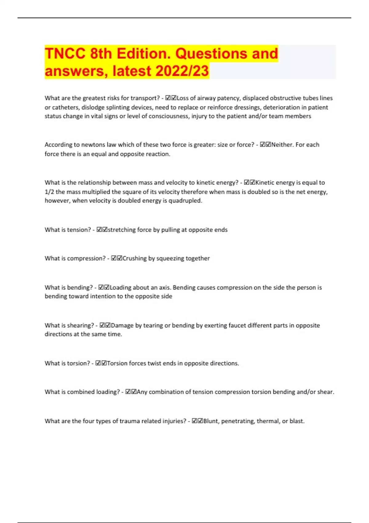 TNCC 8th Edition. Questions and answers, latest 2022/23 Document Content and Description Below What are the greatest risks for transport? - ☑☑Loss of airway patency, displaced obstructive tubes lines or catheters, dislodge splinting devices, need to replace or reinforce dressings, deterior ation in patient status change in vital signs or level of consciousness, injury to the patient and/or team members According to newtons law which of these two force is greater: size or force? - ☑☑Neither. For each force there is an equal and opposite reaction. What is the relationship between mass and velocity to kinetic energy? - ☑☑Kinetic energy is equal to 1/2 the mass multiplied the square of its velocity therefore when mass is doubled so is the net energy, however, when velocity is doubled energy is quadrupled. What is tension? - ☑☑stretching force by pulling at opposite ends What is compression? - ☑☑Crushing by squeezing together What is bending? - ☑☑Loading about an axis. Bending causes compression on the side the person is bending toward intention to the opposite side What is shearing? - ☑☑Damage by tearing or bending by exerting faucet different parts in opposite directions at the same time. What is torsion? - ☑☑Torsion forces twist ends in opposite directions. What is combined loading? - ☑☑Any combination of tension compression torsion bending and/or shear. What are the four types of trauma related injuries? - ☑☑Blunt, penetrating, thermal, or blast.What are contributing factors to injuries related to blunt traumas? - ☑☑The point of impact on the patient's body, the type of surface that is hit, the tissues ability to resist (bone versus soft tissue, airfilled versus solid organs), and the trajectory of force. What are the seven patterns of pathway injuries related to motor vehicle accidents? - ☑☑Up and over, down and under, lateral, rotational, rear, roll over, and ejection. Differentiate between the three impacts of motor vehicle impact sequence. - ☑☑The first impact occurs when the vehicle collided with another object. The second impact occurs after the initial impact when the occupant continues to move in the original direction of travel until they collide with the interior of the vehicle or meet resistance. The third impact occurs when internal structures collide within the body cavity. What are the three factors that contribute to the damage caused by penetrating trauma's? - ☑☑The point of impact, the velocity and speed of impact, and the proximity to the object. What causes the primary effects of blast traumas? - ☑☑The direct blast effects. Types of injuries include last long, tympanic membrane rupture and middle ear damage, abdominal hemorrhage and perforation, global rupture, mild Trumatic brain injury. What causes the secondary effects of blast traumas? - ☑☑Projectiles propelled by the explosion. Injuries include penetrating or blunt injuries or I penetration. What causes the tertiary effects of blast traumas? - ☑☑Results from individuals being thrown by the blast wind. Injuries include hole or partial body translocation from being thrown against a hard service: blunt or penetrating trauma's, fractures, traumatic amputations. What causes quarternary effects of blast traumas? - ☑☑All explosion related injuries, illnesses, or diseases not due to the first three mechanisms. Injuries include external and internal burns, crush injuries, closed and open brain injuries, asthmatic or breathing problems from dust smoke or toxic fumes, angina, or hyper glycemia and hypertension. What causes quinary effects of blasts traumas? - ☑☑Those associated with exposure to hazardous materials from radioactive, biologic, or c