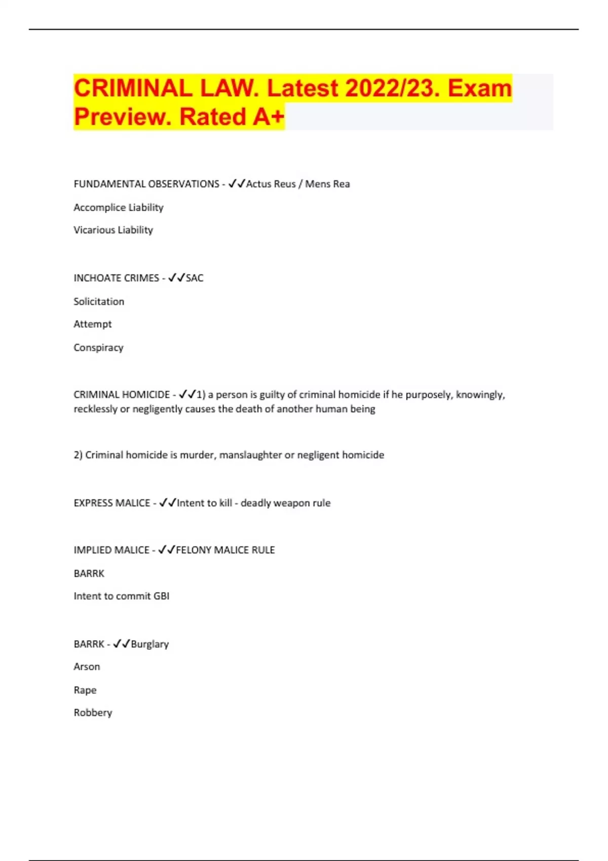 CRIMINAL LAW. Latest 2022/23. Exam Preview. Rated A Document Content and Description Below FUNDAMENTAL OBSERVATIONS - Actus Reus / Mens Rea Accomplice Liability Vicarious Liability INCHOATE CRIMES - SAC Solicitation Attempt Conspiracy CRIMINAL HOMICIDE - 1) a person is guilty of criminal homicide if he purposely, knowingly, recklessly or negligently causes the death of another human being 2) Criminal homicide is murder, manslaughter or negligent homicide EXPRESS MALICE - Intent to kill - deadly weapon rule IMPLIED MALICE - FELONY MALICE RULE BARRK Intent to commit GBI BARRK - Burglary Arson Rape RobberyKidnapping Mayhem HOMICIDE CHECKLIST - IRAC HOMICIDE Causation Actual Proximate MURDER CHECKLIST - a) Malice (key) Murder in first degree Murder in second degree Justification Excuse Mitigation Voluntary manslaughter Involuntary manslaughter HOMICIDE DEF - Killing of a human being by another human being HUMAN BEING Common Law - Circulation independent of mother HUMAN BEING Modern Law - Viable fetus in process of being born CAUSATION - D's act must be the actual cause and proximate cause of the criminally proscribed act 1) Common Law: Requires cessation of heartbeat and respiration 2) Modern Law: Requires permanent cessation of brain activity CAUSATION (CONT) - victim must die within ONE YEAR and a DAY (common day)Look to result and D's intent CAUSATION APPROACH - 1) cause in fact: "BUT FOR" (if only perpetrator) / substantial factor (use substantial factor test if multiple perpetrators - otherwise, e.g., neither of teh two murderers, each inflicting mortal wounds, will be found guilty under "BUT FOR" test 2) DIRECT 3) INDIRECT 4) DEPENDENT 5) INDEPEDENT 6) FORESEEABLE 7) UNFORESEEABLE MURDER - Unlawful killing of a human being committed with malice aforethought MALICE - MENS REA - 1) Intent to kill OR 2) Intent to cause serious bodily harm OR 3) Wanton and reckless conduct "depraved heart" (most testable) or 4) Felony MURDER RULE FELONY MURDER RULE - any homicide committed in the perpetration of an inherently dangerous felony (minority : felony committed in a dangerous manner) BARRM / KSS - 1. Burglary, arson, rape, robbery, mayhem, kidnapping, sodomy, sexual molestation 2. Attempted BARRM / KSS will suffic