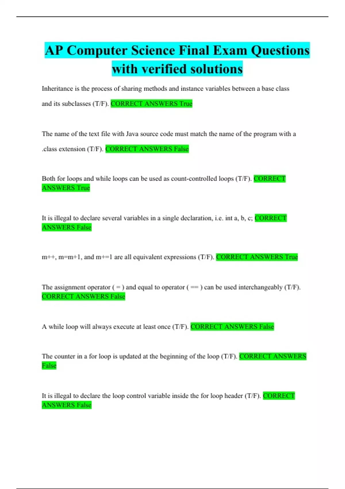 ap computer science final exam questions with verified solutions