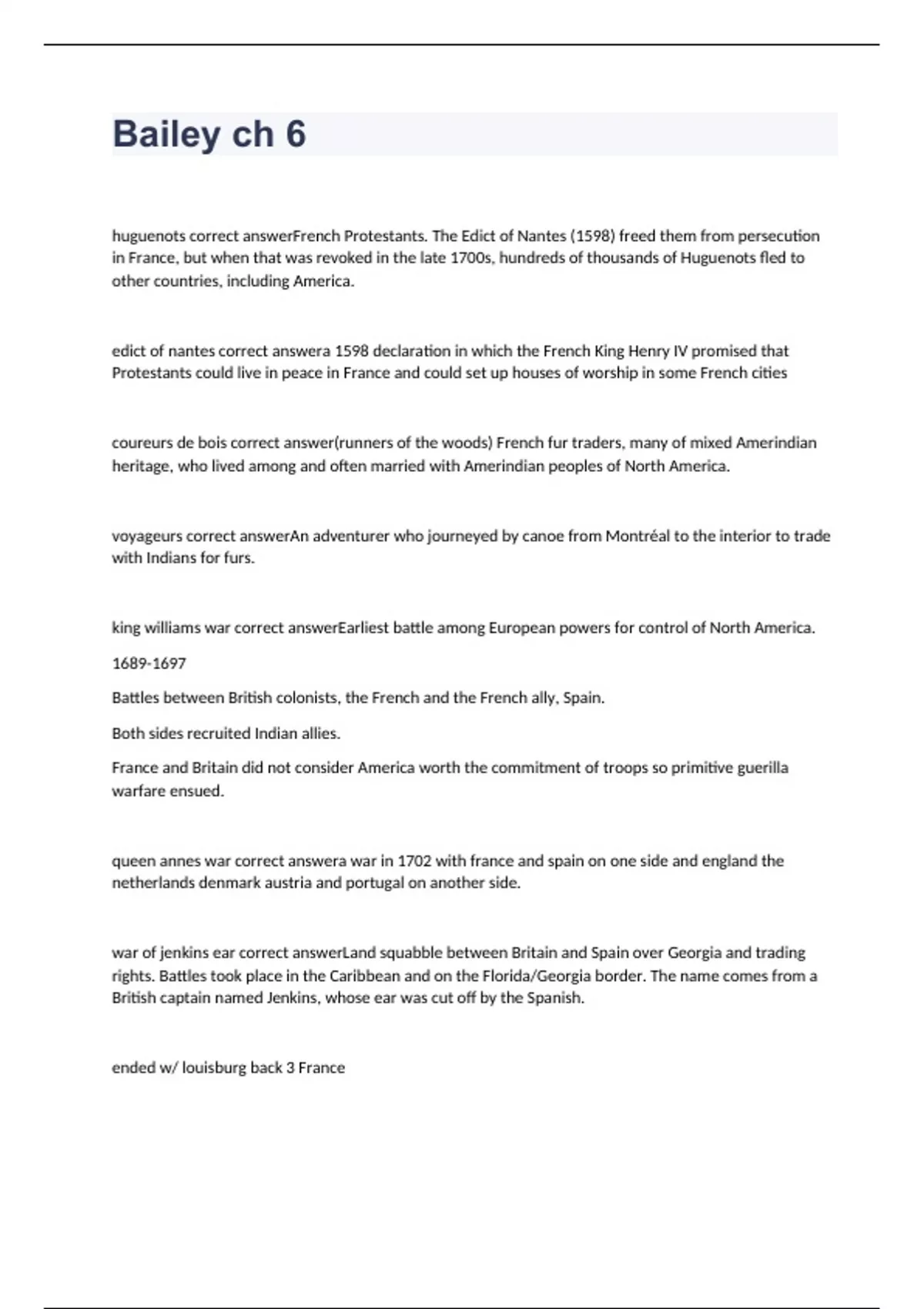 huguenots French Protestants. The Edict of Nantes (1598) freed them from persecution in France, but when that was revoked in the late 1700s, hundreds of thousands of Huguenots fled to other countries, including America. edict of nantes a 1598 declaration in which the French King Henry IV promised that Protestants could live in peace in France and could set up houses of worship in some French cities coureurs de bois (runners of the woods) French fur traders, many of mixed Amerindian heritage, who lived among and often married with Amerindian peoples of North America. voyageurs An adventurer who journeyed by canoe from Montréal to the interior to trade with Indians for furs. king williams war Earliest battle among European powers for control of North America. Battles between British colonists, the French and the French ally, Spain. Both sides recruited Indian allies. France and Britain did not consider America worth the commitment of troops so primitive guerilla warfare ensued. queen annes war a war in 1702 with france and spain on one side and england the netherlands denmark austria and portugal on another side. war of jenkins ear Land squabble between Britain and Spain over Georgia and trading rights. Battles took place in the Caribbean and on the Florida/Georgia border. The name comes from a British captain named Jenkins, whose ear was cut off by the Spanish. ended w/ louisburg back 3 France king george's war Land squabble between France and Britain. France tried to retake Nova Scotia (which it had lost to Britain in Queen Anne's War). The war ended with a treaty restoring the status quo, so that Britain kept Nova Scotia). acadians French residents of Nova Scotia, many of whom were uprooted by the British in 1755 and scattered as far south as Louisiana, where their descendants became known as "Cajuns". (116) french and indian war Was a war fought by French and English on American soil over control of the Ohio River Valley-- English defeated French in1763. Historical Significance: established England as number one world power and began to gradually change attitudes of the colonists toward England for the worse. albany congress A meeting in Albany, New York, in 1754, in which the British colonies attempted to make an alliance with the Iroquois tribe in order to end their differences. The Iroquois, however, rejected the offer. regulars (def.) Trained professional soldiers, as distinct from militia or conscripts (sig.) The barely-trained colonists defeated the British regulars at Great Bridge, showing they could defeat the British.
