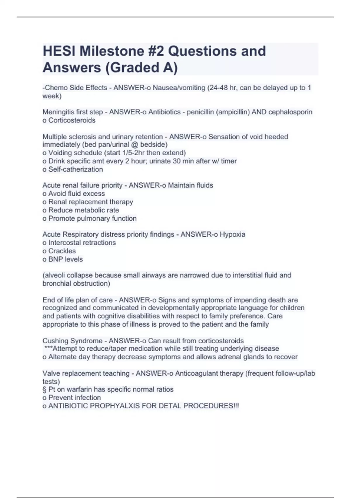 HESI Milestone #2 Questions and Answers (Graded A)HESI Milestone #2 Questions and Answers (Graded A) -Chemo Side Effects - ANSWER-o Nausea/vomiting (24-48 hr, can be delayed up to 1 week) Meningitis first step - ANSWER-o Antibiotics - penicillin (ampicillin) AND cephalosporin o Corticosteroids Multiple sclerosis and urinary retention - ANSWER-o Sensation of void heeded immediately (bed pan/urinal @ bedside) o Voiding schedule (start 1/5-2hr then extend) o Drink specific amt every 2 hour; urinate 30 min after w/ timer o Self-catherization Acute renal failure priority - ANSWER-o Maintain fluids o Avoid fluid excess o Renal replacement therapy o Reduce metabolic rate o Promote pulmonary function Acute Respiratory distress priority findings - ANSWER-o Hypoxia o Intercostal retractions o Crackles o BNP levels (alveoli collapse because small airways are narrowed due to interstitial fluid and bronchial obstruction) End of life plan of care - ANSWER-o Signs and symptoms of impending death are recognized and communicated in developmentally appropriate language for children and patients with cognitive disabilities with respect to family preference. Care appropriate to this phase of illness is proved to the patient and the family Cushing Syndrome - ANSWER-o Can result from corticosteroids ***Attempt to reduce/taper medication while still treating underlying disease o Alternate day therapy decrease symptoms and allows adrenal glands to recover Valve replacement teaching - ANSWER-o Anticoagulant therapy (frequent follow-up/lab tests) § Pt on warfarin has specific normal ratios o Prevent infection o ANTIBIOTIC PROPHYALXIS FOR DETAL PROCEDURES!!!