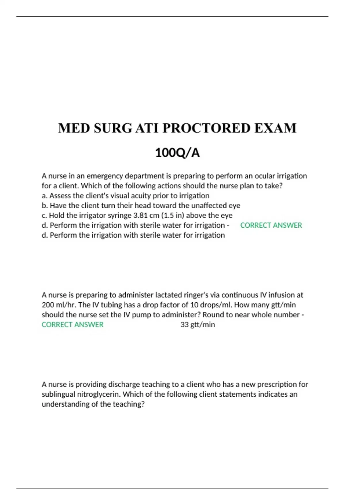MED SURG ATI PROCTORED EXAM 100Q/A A nurse in an emergency department is preparing to perform an ocular irrigation for a client. Which of the following actions should the nurse plan to take? a. Assess the client's visual acuity prior to irrigation b. Have the client turn their head toward the unaffected eye c. Hold the irrigator syringe 3.81 cm (1.5 in) above the eye d. Perform the irrigation with sterile water for irrigation - CORRECT ANSWER d. Perform the irrigation with sterile water for irrigation A nurse is preparing to administer lactated ringer's via continuous IV infusion at 200 ml/hr. The IV tubing has a drop factor of 10 drops/ml. How many gtt/min should the nurse set the IV pump to administer? Round to near whole number - CORRECT ANSWER 33 gtt/min