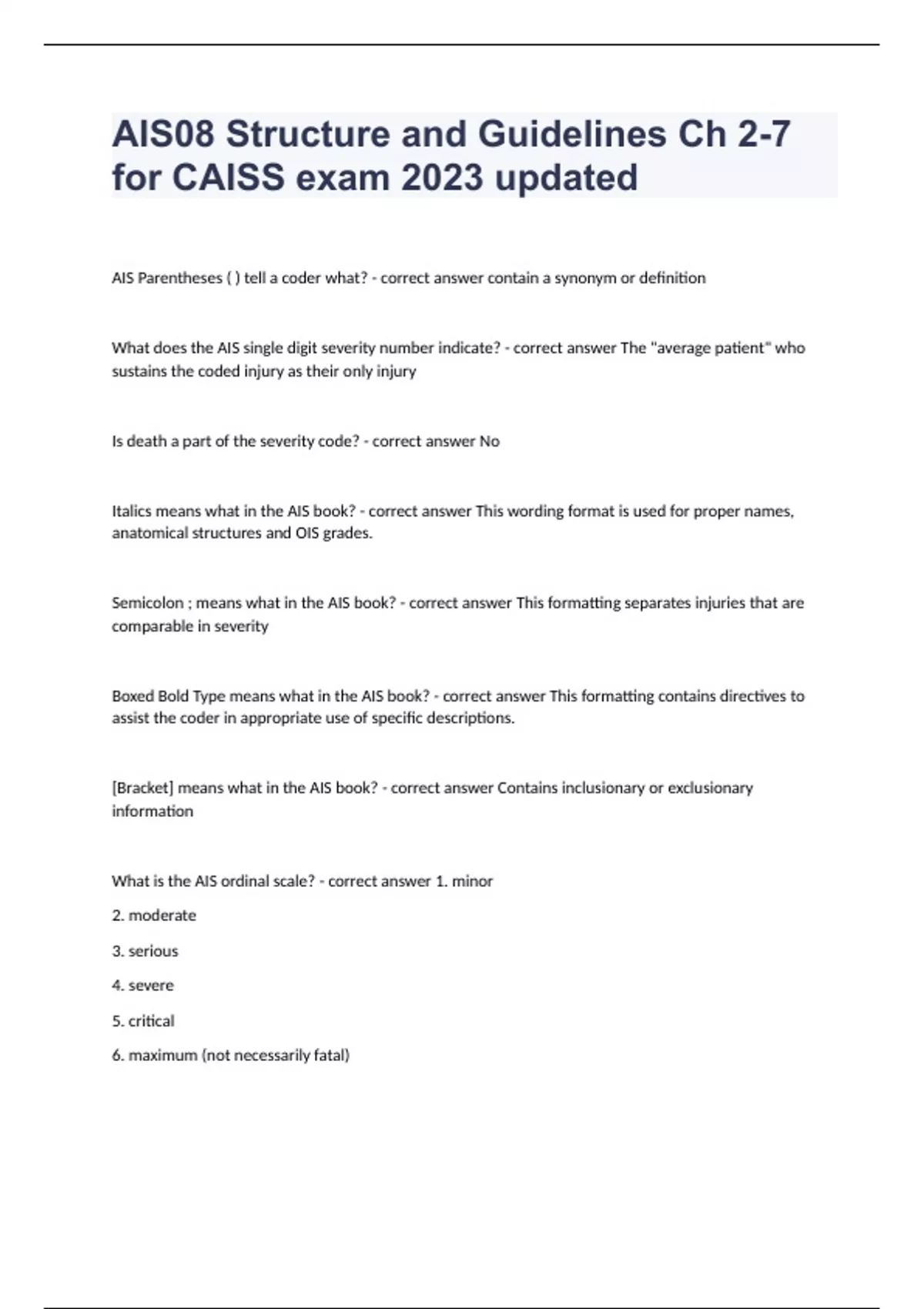 AIS08 Structure and Guidelines Ch 2-7 for CAISS exam 2023 updatedAIS Parentheses ( ) tell a coder what? - correct answer contain a synonym or definition What does the AIS single digit severity number indicate? - correct answer The "average patient" who sustains the coded injury as their only injury Is death a part of the severity code? - correct answer No Italics means what in the AIS book? - correct answer This wording format is used for proper names, anatomical structures and OIS grades. Semicolon ; means what in the AIS book? - correct answer This formatting separates injuries that are comparable in severity Boxed Bold Type means what in the AIS book? - correct answer This formatting contains directives to assist the coder in appropriate use of specific descriptions. [Bracket] means what in the AIS book? - correct answer Contains inclusionary or exclusionary information What is the AIS ordinal scale? - correct answer 1. minor 2. moderate 3. serious 4. severe 5. critical 6. maximum (not necessarily fatal) What is AIS fundamentally? - correct answer A severity injury scale Examples of allowed AIS sequela that can be coded - correct answer hemothorax pneumothorax retroperitoneal hemorrhage cerebral edema brain swelling ischemic brain damage directly related to head trauma What body area is penetrating? - correct answer External Two ways to derive a 75 ISS - correct answer a single AIS 6 AIS 5 in 3 body regions What is the range of ISS? - correct answer 1-75 What body area is electrical injury assigned to? - correct answer external What body area is drowning assigned to? - correct answer chest What body area is asphyxia assigned to? - correct answer head What body area is lumbar spine? - correct answer abdomen/pelvic region What body area is thoracic spine? - correct answer chest What body area is C-spine? - correct answer head and neck What are the body regions in ISS? - correct answer 1. head and neck