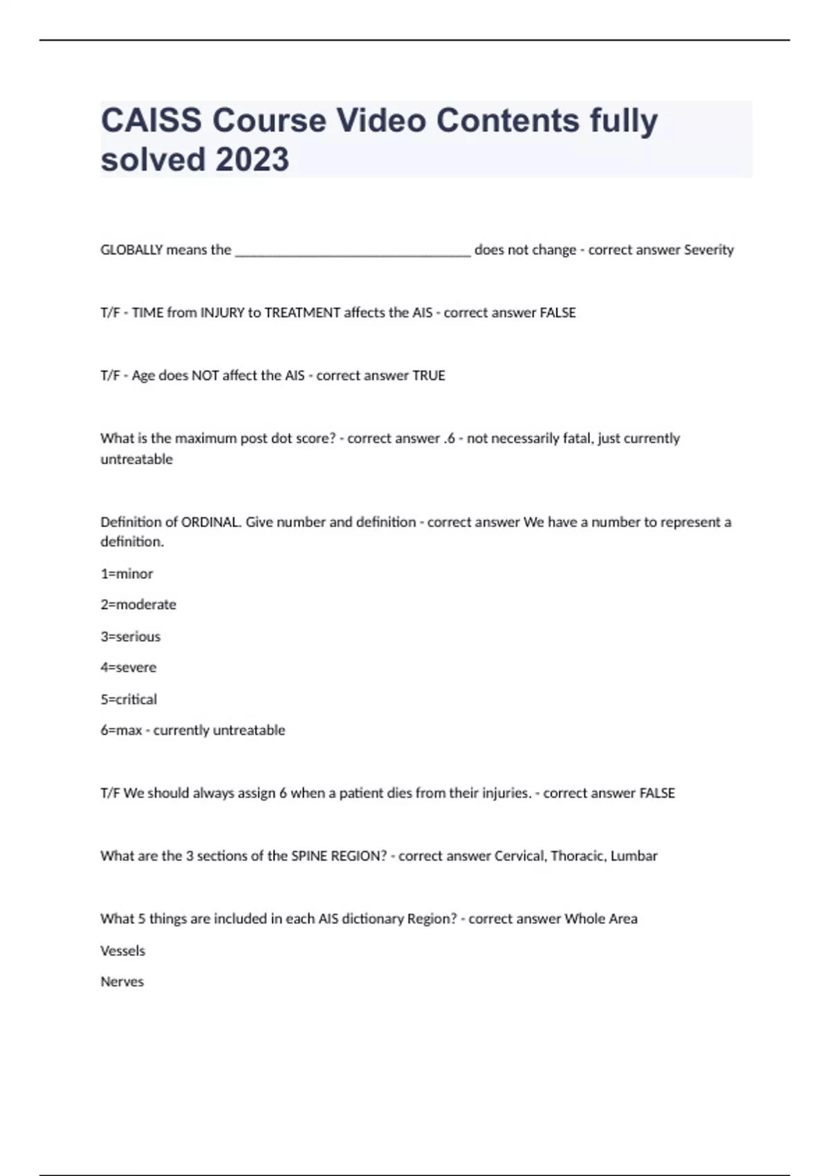 CAISS Course Video Contents fully solved 2023 GLOBALLY means the _______________________________ does not change - correct answer Severity T/F - TIME from INJURY to TREATMENT affects the AIS - correct answer FALSE T/F - Age does NOT affect the AIS - correct answer TRUE What is the maximum post dot score? - correct answer .6 - not necessarily fatal, just currently untreatable Definition of ORDINAL. Give number and definition - correct answer We have a number to represent a definition. 1=minor 2=moderate 3=serious 4=severe 5=critical 6=max - currently untreatable T/F We should always assign 6 when a patient dies from their injuries. - correct answer FALSE What are the 3 sections of the SPINE REGION? - correct answer Cervical, Thoracic, Lumbar What 5 things are included in each AIS dictionary Region? - correct answer Whole Area Vessels Nerves Internal Organs