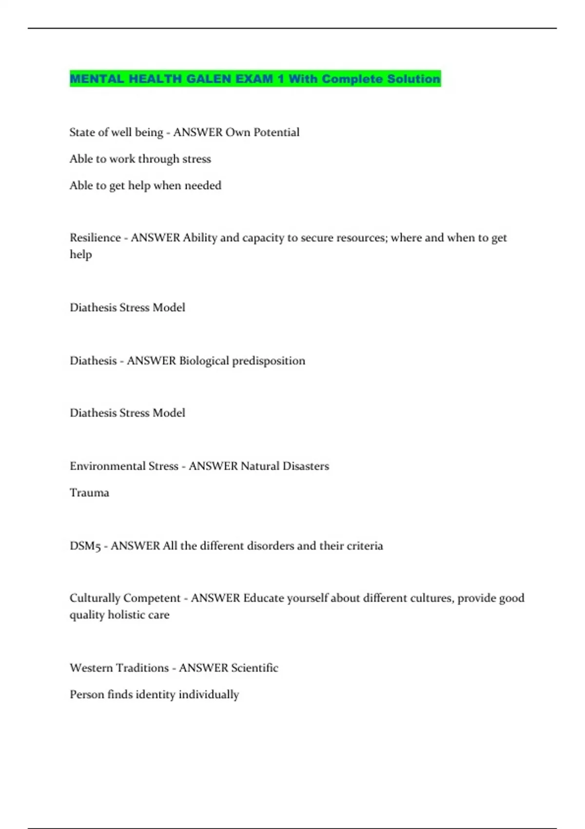 MENTAL HEALTH GALEN EXAM 1 With Complete Solution...
