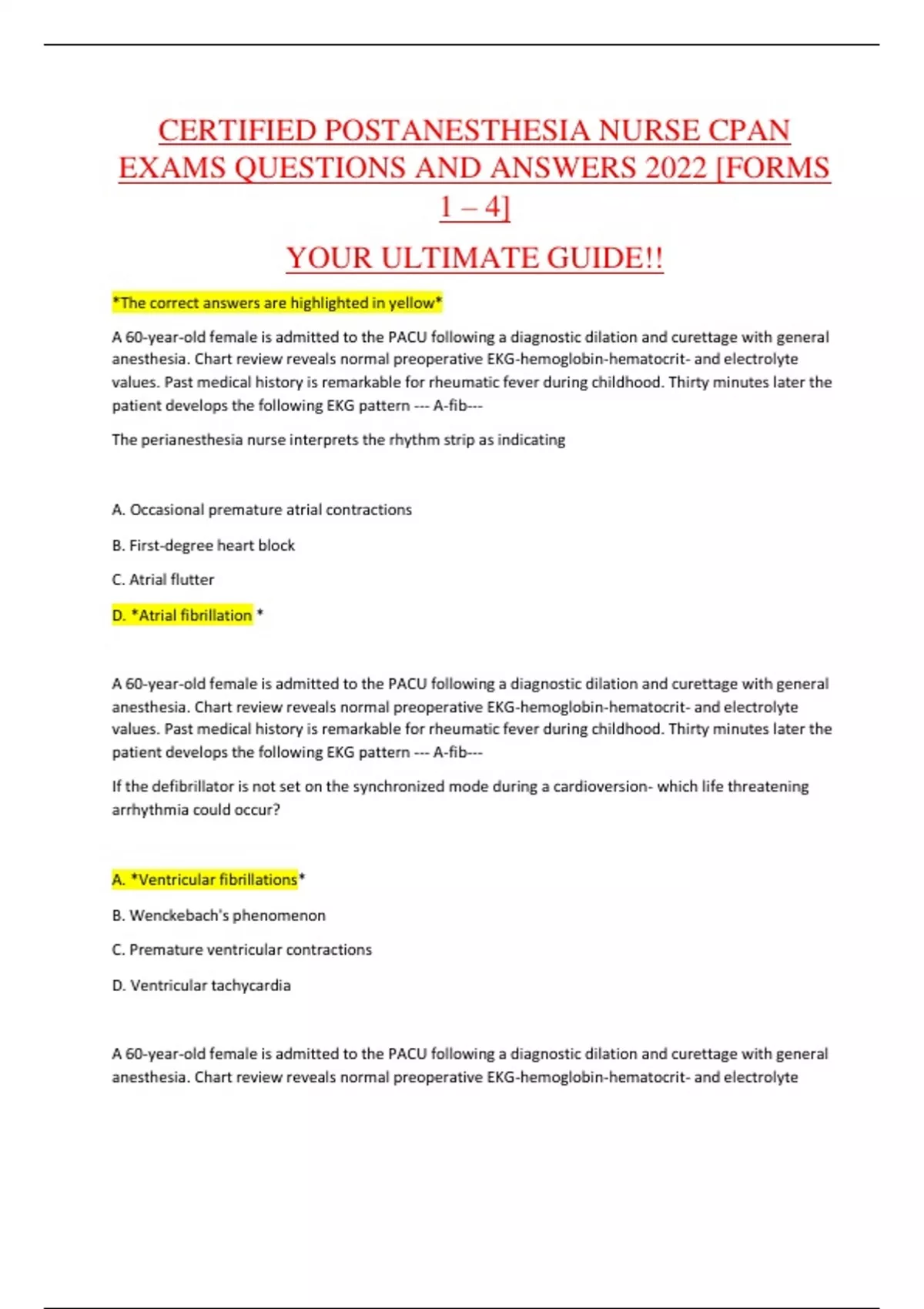 Certified Postanesthesia Nurse CPAN Exams Questions and Answers 2022 [Forms 1 – 4] Your Ultimate Guide!!| *The correct answers are highlighted in yellow* A 60-year-old female is admitted to the PACU following a diagnostic dilation and curettage with general anesthesia. Chart review reveals normal preoperative EKG-hemoglobin-hematocrit- and electrolyte values. Past medical history is remarkable for rheumatic fever during childhood. Thirty minutes later the patient develops the following EKG pattern --- A-fib---...